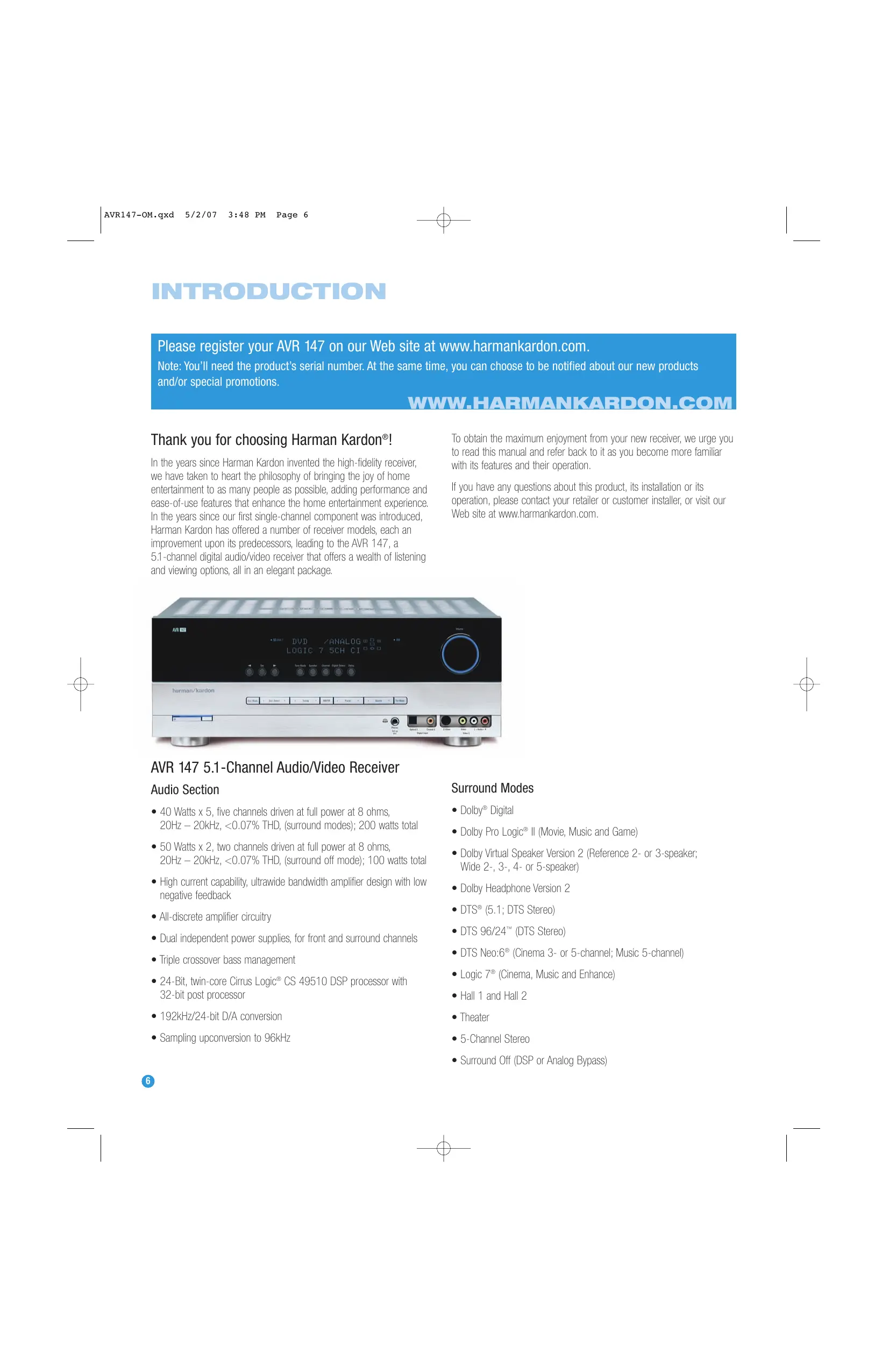 AVR147-OM.qxd 5/2/07 3:48 PM Page 6 Please register your AVR 147 on our Web site at www.harmankardon.com. Note: You’ll need the product's serial number. At the same time, you can choose to be notified about our new products and/or special promotions. Thank you for choosing Harman Kardon®! In the vears since Harman Kardon invented the high-fidelity receiver, we have taken to heart the philosophy of bringing the joy of home entertainment to as many people as possible, adding performance and ease-of-use features that enhance the home entertainment experience. In the years since our first single-channel component was introduced, Harman Kardon has offered a number of receiver models, each an improvement upon its predecessors, leading to the AVR 147, a 51-channel digital audio/video receiver that offers a wealth of listening and viewing options, all in an elegant package. To obtain the maximum enjoyment from your new receiver, we urge you to read this manual and refer back to it as you become more familiar with its features and their operation. If you have any questions about this product, its installation or its operation, please contact your retaller or customer installer, or visit our Web site at wwn.harmankardon.com. MLIMMZISISERERRRS. AVR 147 5.1-Channel Audio/Video Receiver Audio Section + 40 Watts x 5, five channels driven at full power at 8 ohms, 20Hz — 20kHz, <0.07% THD, (surround modes); 200 watts total + 50 Watts x 2, two channels driven at full power at 8 ohms, 20Hz — 20kHz, <0.07% THD, (surround off mode); 100 watts total < High current capability, ultrawide bandwidth amplifier design with low negative feedback < Al-discrete amplifier circuitry < Dual independent power supplies, for front and surround channels < Triple crossover bass management < 24-Bit, twin-core Cirrus Logic® CS 49510 DSP processor with 32-bit post processor + 192kHz/24-bit D/A conversion + Sampling upconversion to 96kHz