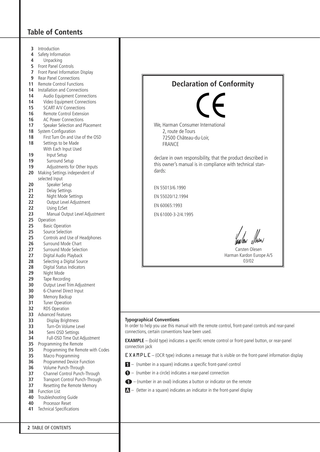 Carsten Olesen Harman Kardon Europe A/S 03/02 Typographical Conventions In order to help you use this manual with the remote control, front-panel controls and rear-panel connections, certain conventions have been used. EXAMPLE — (bold type) indicates a specific remote control or front-panel button, or rear-panel connection jack EXAMPLE — (OCR type) indicates a message that is visible on the front-panel information display — (number in a square) indicates a specific front-panel control © - (number in a circle) indicates a rear-panel connection © - (number in an oval) indicates a button or indicator on the remote EN- (letter in a square) indicates an indicator in the front-panel display