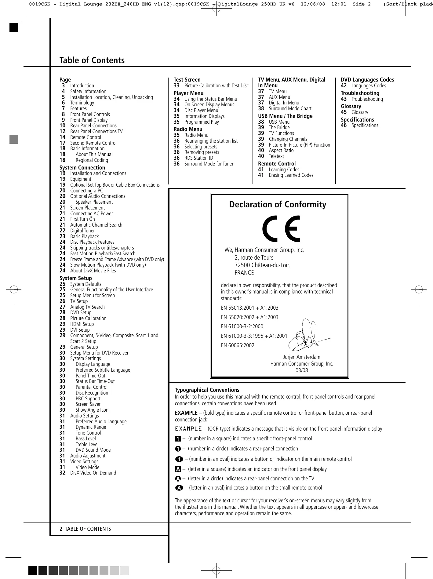 Introduction Thank you for choosing Harman Kardon! With the purchase of a Harman Kardon Digital Lounge system you are about to begin many years of listening enjoyment. Designed to provide all the excitement and detail of movie soundtracks and every nuance ofmusical selections using only one pair of stereoloudspeak- ers and a subwoofer, the Digital Lounge is truly à multichannel system for the new millennium. The Digital Lounge system has been engineered so that it is easy to take advantage of all the power of its digital technology. To obtain the maximum enjoyment from your new system, we urge you to read this manual. À few minutes spent learning the functions of the various con- trols will enable you to take advantage of all the power the Digital Lounge system is able to deliver. If you have any questions about this product, its installation or its operation, please contact your retailer or custom installer. They are your best local sources of information. Description and Features The Digital Lounge system is among the most complete and versatile home cinema systems. It incorporates à range of carefully designed, sophisticated integrated system components that combine an Audio Video Controller, DVD Audio player, a flat panel TV, 2.1 loudspeaker system and floor stands. The Dolby® Virtual Speaker surround modes for Matrix surround-encoded or Stereo recordings is available for use with sources such as CD, VCR, TV broadcasts and the system's own FM tuner. Harman Kardon Digital Lounge system offers our well-known audio and video performance and ease of use, together with complete control via one dedicated system remote control. Along with conventional Video and CD audio discs, the Digital Lounge is also compatible with MP3, CD-R and CD-RW as well as DivX® and VCD discs. To enable you to get the maximum quality from DVDs, the Digital Lounge system is equipped with the latest in design techniques, including à High Definition Multimedia Interface delivering the finest quality digital video transmitted over one single cable from the Harman Kardon Digital Lounge receiver/DVD-Audio player to the Harman Kardon Digital Lounge display. The one- way HDMI connection will allow you to watch your blockbuster movies in a high resolution up to 720p or 1080i. A DVI input to connect a PC is available too, as well as multiple HDMI inputs. The 40"display is a Full HD display, fully compli- ant with future HD signals, ready to bring the latest technology for clearer and sharper pictures into your home. The 32" version is HD Ready. With one simple connection between the Digital Lounge and the Harman Kardon Bridge. , you are able to listen to audio files stored on your compatible Apple iPod®**. The Bridge" will even let you charge your iPod. Along with conventional Video and CD audio discs, the Digital Lounge system is also compatible with MP3, CD-R and CD-RW as well as DivX° and VCD discs. As portable USB devices increase in popularity, Harman Kardon's Digital Lounge system is among the first integrated home theater system that allows mobile interconnectivity by playing compatible music or image files from portable devices via two USB On-The-Go inputs. NOTE: This player is designed and manufactured for compatibility with Region Management Information that is encoded on most DVD discs. This player is designed only for playback of discs with Region Code 2, or for discs that do not contain Region Code information. If there is any other Region Code on a disc, that disc will not play on the DVD. A wide range of programming features makes it easy to program an evening's worth of entertain- ment. When playing DVDs, easy-to-understand on-screen menus and icons make it simple to change languages, soundtracks, subtitles or aspect ratio, while a parental-lock function enables you to control which discs may be viewed by younger members of the household For total user convenience, Harman Kardon Digital Lounge offers a system remote control, ready to operate the screen, the DVD player and the receiver. Besides the standard full function remote control used for initial setup and system calibration, Harman Kardon offers a second and smaller remote control. By limiting the buttons on this remote control to those that will be used during every day use, system control becomes extremely easy and pleasant. M Plays a Wide Range of Video and Audio Formats, Including DVD-Video Discs, VCD, Standard CD Audio Discs, CD-R/RW, DVD-R/RW, DVD-+R/RW, Audio Discs and MP3 Discs M HDMI One-wire Digital Video Connection between the Screen and the Controller MHigh-Quality Video Playback 10-Bit DACSs, Progressive Scan M Independent Picture Calibrations for Each Individual Input ENGLISH INTRODUCTION 3 0019CSK - Digital Lounge 232EX 240HD ENG vl(12).qxp:0019CSK 2 talLounge 250HD UK v6 12/06/08 12:01 Side 3 ere plad
