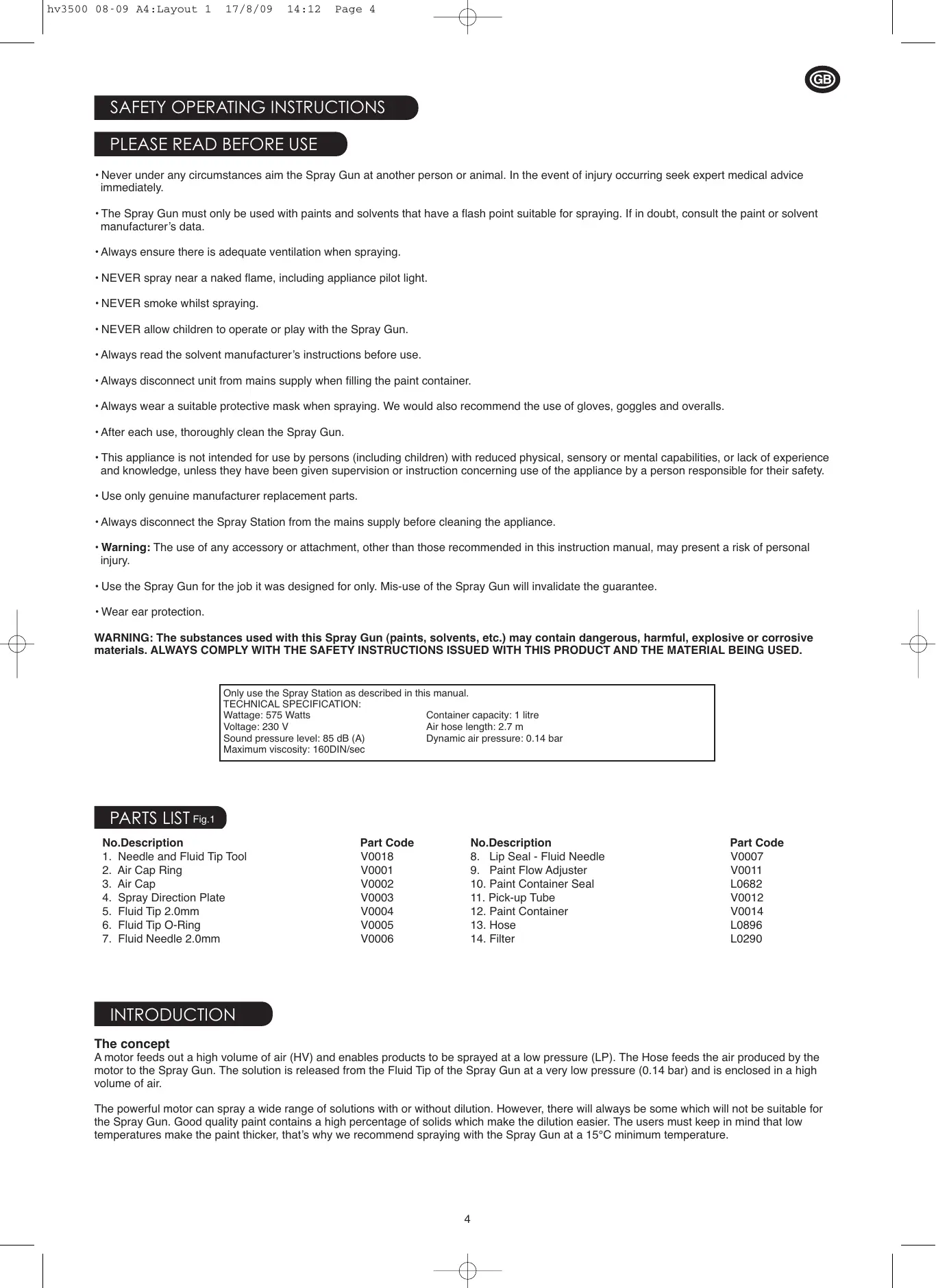Part Code V0007 V0011 L0682 V0012 V0014 L0896 L0290 INTRODUCTION The concept A motor feeds out a high volume of air (HV) and enables products to be sprayed at a low pressure (LP). The Hose feeds the air produced by the motor to the Spray Gun. The solution is released from the Fluid Tip of the Spray Gun at a very low pressure (0.14 bar) and is enclosed in a high volume of air. The powerful motor can spray a wide range of solutions with or without dilution. However, there will always be some which will not be suitable for the Spray Gun. Good quality paint contains a high percentage of solids which make the dilution easier. The users must keep in mind that low temperatures make the paint thicker, that’s why we recommend spraying with the Spray Gun at a 15°C minimum temperature.