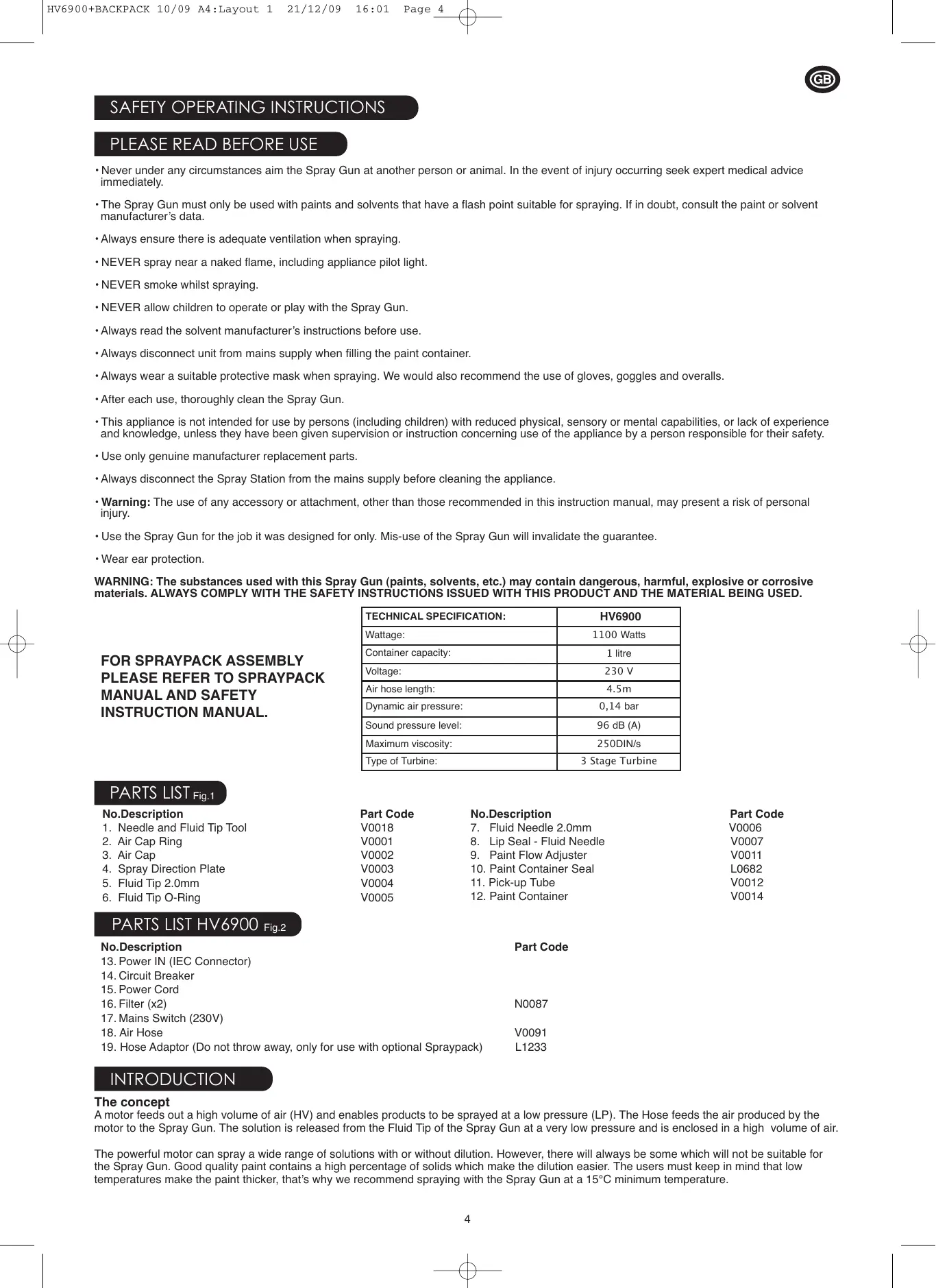 Part Code V0006 V0007 V0011 L0682 V0012 V0014 Part Code N0087 V0091 L1233 INTRODUCTION The concept A motor feeds out a high volume of air (HV) and enables products to be sprayed at a low pressure (LP). The Hose feeds the air produced by the motor to the Spray Gun. The solution is released from the Fluid Tip of the Spray Gun at a very low pressure and is enclosed in a high volume of air. The powerful motor can spray a wide range of solutions with or without dilution. However, there will always be some which will not be suitable for the Spray Gun. Good quality paint contains a high percentage of solids which make the dilution easier. The users must keep in mind that low temperatures make the paint thicker, that’s why we recommend spraying with the Spray Gun at a 15°C minimum temperature.