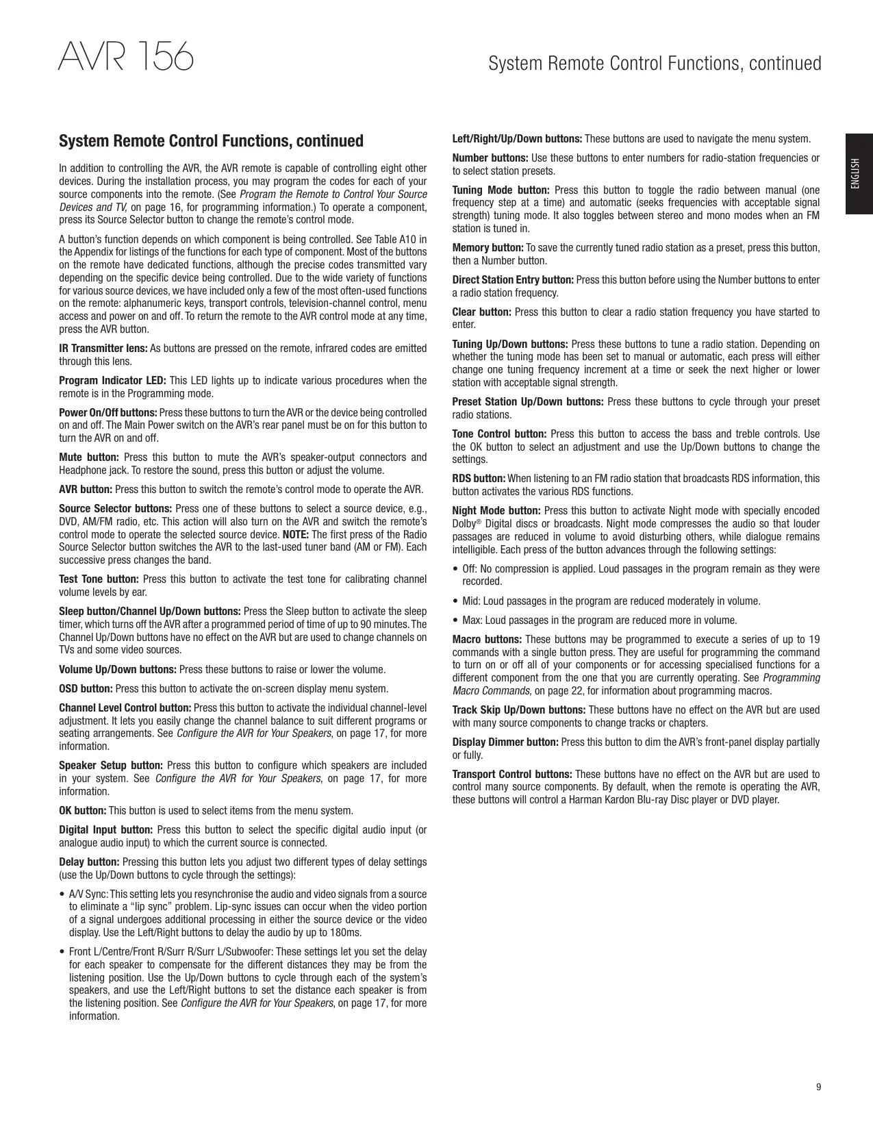 AVR 156 System Remote Control Functions