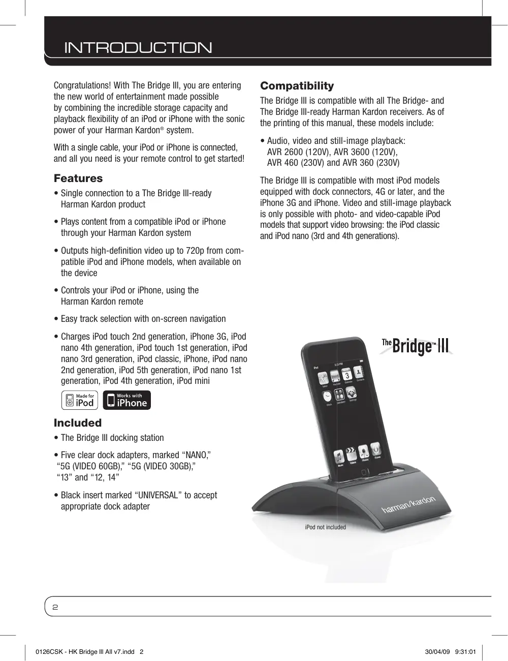 The Bridge Ill is compatible with most iPod models equipped with dock connectors, 4G or later, and the iPhone 3G and iPhone. Video and still-image playback is only possible with photo- and video-capable iPod models that support video browsing: the iPod classic and iPod nano (3rd and 4th generations).