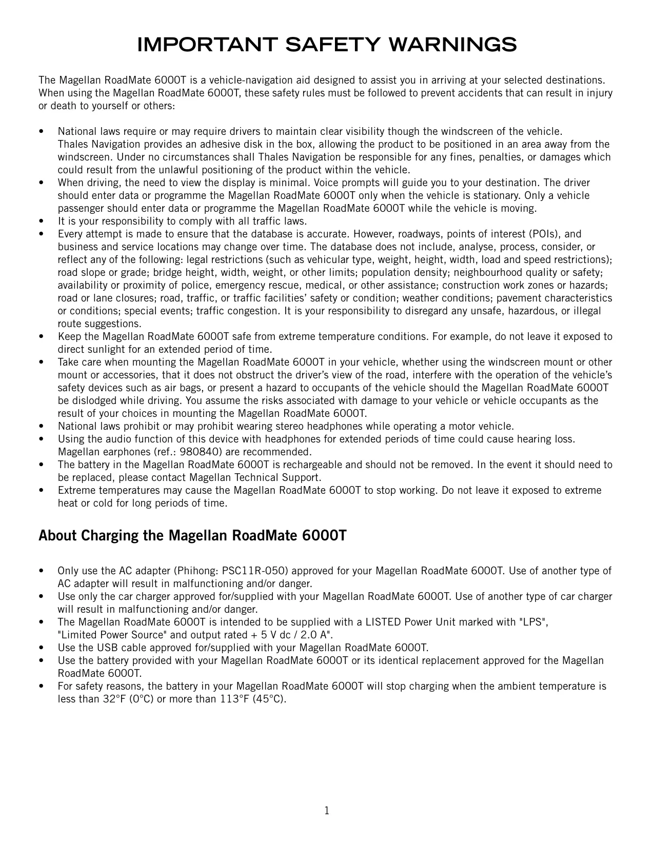 The Magellan RoadMate 6000T is a vehicle-navigation aid designed to assist you in arriving at your selected destinations. When using the Magellan RoadMate 6000T, these safety rules must be followed to prevent accidents that can result in injury or death to yourself or others: National laws require or may require drivers to maintain clear visibility though the windscreen of the vehicle. Thales Navigation provides an adhesive disk in the box, allowing the product to be positioned in an area away from the windscreen. Under no circumstances shall Thales Navigation be responsible for any fines, penalties, or damages which could result from the unlawful positioning of the product within the vehicle. When driving, the need to view the display is minimal. Voice prompts will guide you to your destination. The driver should enter data or programme the Magellan RoadMate 60007 only when the vehicle is stationary. Only a vehicle passenger should enter data or programme the Magellan RoadMate 6000T while the vehicle is moving. It is your responsibility to comply with all traffic laws. Every attempt is made to ensure that the database is accurate. However, roadways, points of interest (POIs), and business and service locations may change over time. The database does not include, analyse, process, consider, or reflect any of the following: legal restrictions (such as vehicular type, weight, height, width, load and speed restrictions); road slope or grade; bridge height, width, weight, or other limits; population density; neighbourhood quality or safety; availability or proximity of police, emergency rescue, medical, or other assistance; construction work zones or hazards; road or lane closures; road, traffic, or traffic facilities’ safety or condition; weather conditions; pavement characteristics or conditions; special events; traffic congestion. It is Your responsibility to disregard any unsafe, hazardous, or illegal route suggestions. Keep the Magellan RoadMate 6000T safe from extreme temperature conditions. For example, do not leave it exposed to direct sunlight for an extended period of time. Take care when mounting the Magellan RoadMate 6000T in your vehicle, whether using the windscreen mount or other mount or accessories, that it does not obstruct the driver's view of the road, interfere with the operation of the vehicle's safety devices such as air bags, or present a hazard to occupants of the vehicle should the Magellan RoadMate 6000T be dislodged while driving. You assume the risks associated with damage to your vehicle or vehicle occupants as the result of your choices in mounting the Magellan RoadMate 6000T. National laws prohibit or may prohibit wearing stereo headphones while operating a motor vehicle. Using the audio function of this device with headphones for extended periods of time could cause hearing loss. Magellan earphones (ref.: 980840) are recommended. The battery in the Magellan RoadMate 6000T is rechargeable and should not be removed. In the event it should need to be replaced, please contact Magellan Technical Support. Extreme temperatures may cause the Magellan RoadMate 6000T to stop working. Do not leave it exposed to extreme heat or cold for long periods of time. About Charging the Magellan RoadMate 6000T Only use the AC adapter (Phihong: PSC11R-050) approved for your Magellan RoadMate 6000T. Use of another type of AC adapter will result in malfunctioning and/or danger. Use only the car charger approved for/supplied with your Magellan RoadMate 60007. Use of another type of car charger will result in malfunctioning and/or danger. The Magellan RoadMate 6000T is intended to be supplied with a LISTED Power Unit marked with "LPS", "Limited Power Source" and output rated + 5 V dc / 2.0 A". Use the USB cable approved for/supplied with your Magellan RoadMate 6000T. Use the battery provided with your Magellan RoadMate 6000T or its identical replacement approved for the Magellan RoadMate 6000T. For safety reasons, the battery in your Magellan RoadMate 6000T will stop charging when the ambient temperature is less than 32°F (0°C) or more than 113°F (45°C).