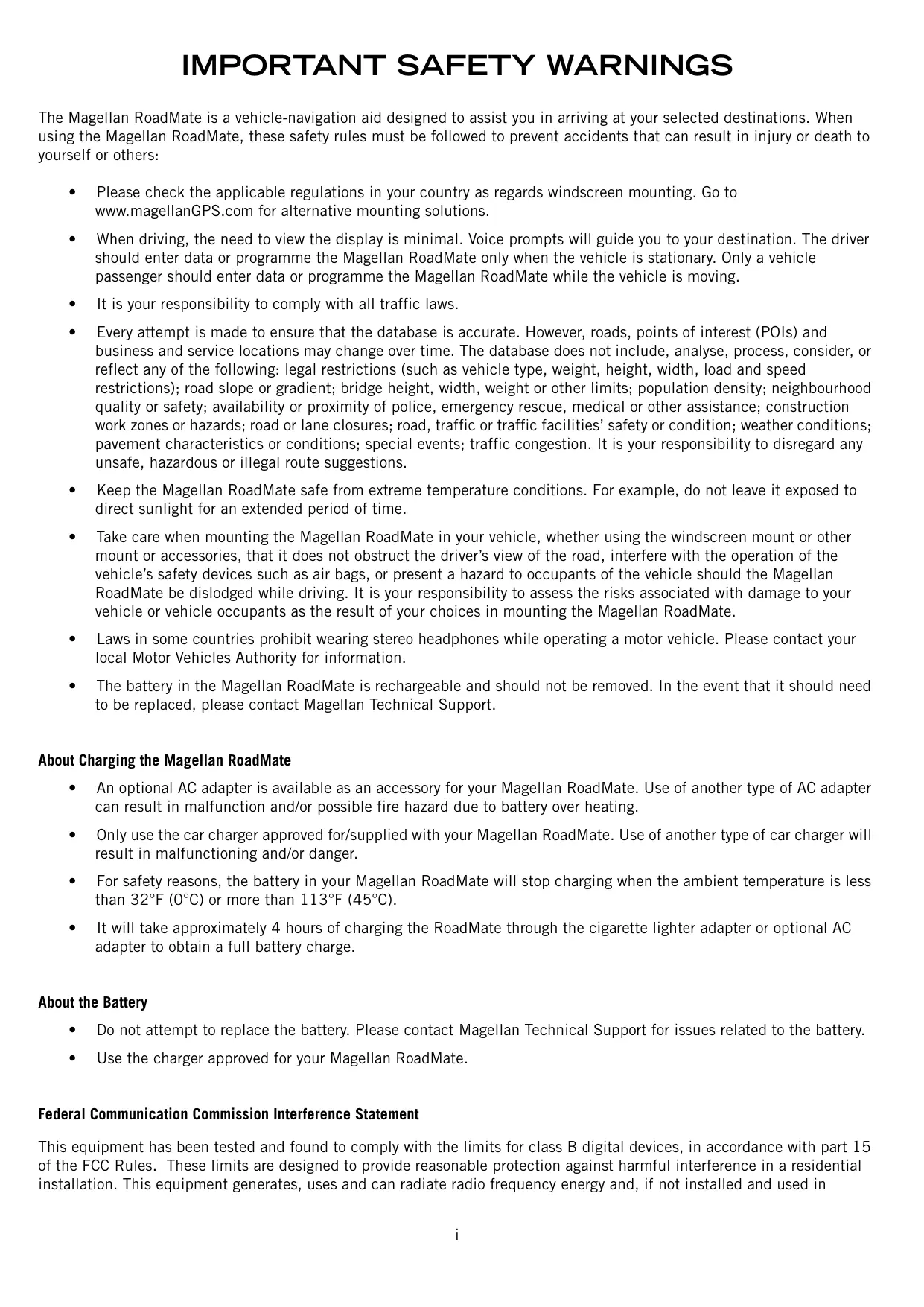 The Magellan RoadMate is a vehicle-navigation aid designed to assist you in arriving at your selected destinations. When using the Magellan RoadMate, these safety rules must be followed to prevent accidents that can result in injury or death to yourself or others: