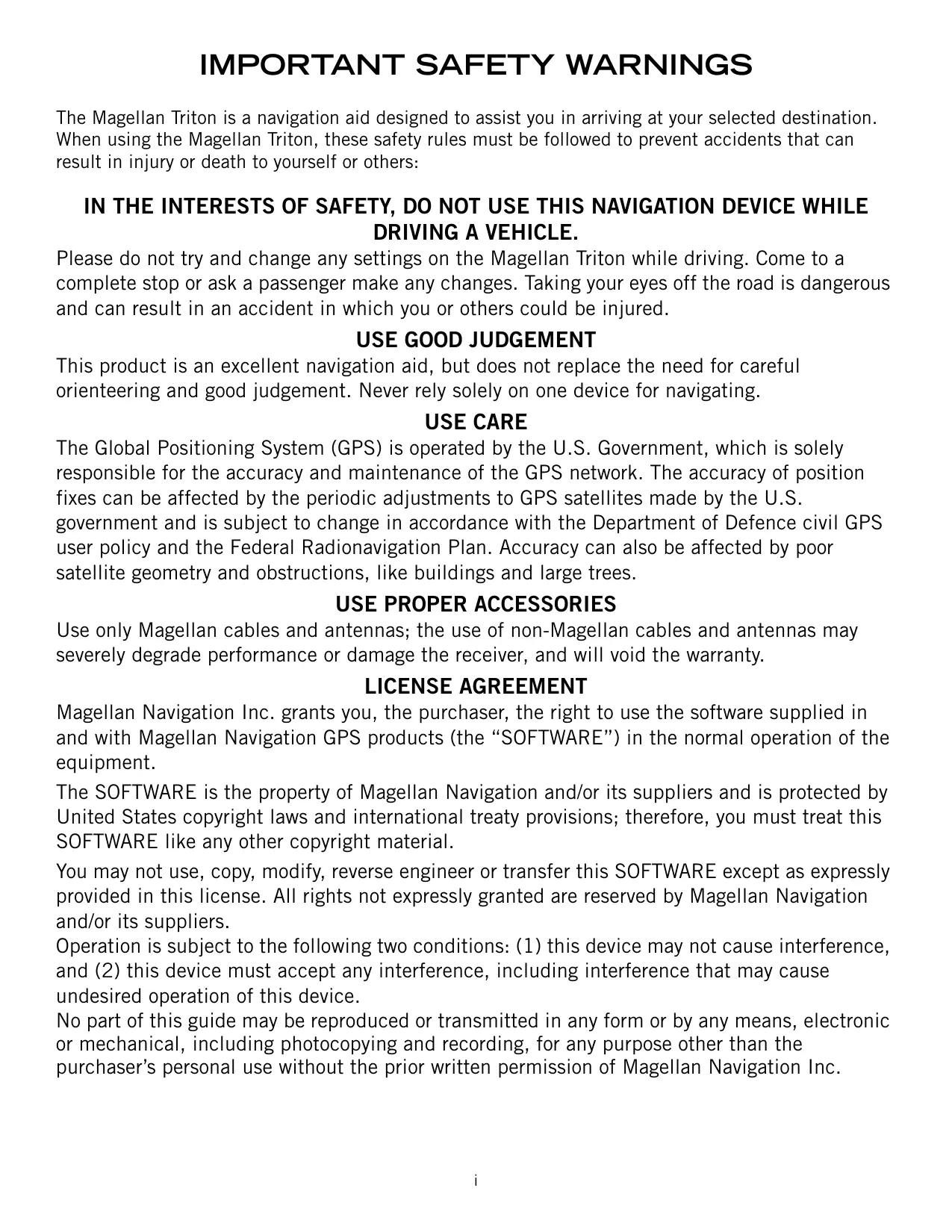 The Magellan Triton is a navigation aid designed to assist you in arriving at your selected destination. When using the Magellan Triton, these safety rules must be followed to prevent accidents that can result in injury or death to yourself or others: