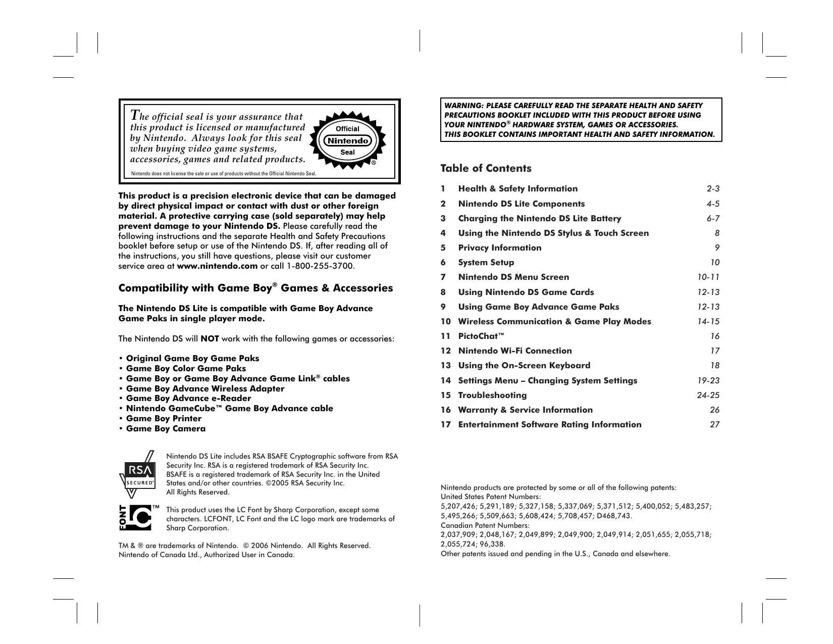 The official seal is your assurance that this product is licensed or manufactured by Nintendo. Always look for this seal when buying video game systems, accessories, games and related products. Official Seal Nintendo does ntlicense th sale or use of praduets without the Oficil Nimand Seal. This product is a precision electronic device that can be damaged by direct physical impact or contact with dust or other foreign material. À protective carrying case (sold separately) may help prevent damage to your Nintendo DS. Please carefully read the following instructions and the separate Health and Safety Precautions booklet before setup or use of the Nintendo DS. If, after reading all of the instructions, you still have questions, please visit our customer service area at www.nintendo.com or call 1-800-255-3700. Compatibility with Game Boy® Games & Accessories The Nintendo DS Lite is compatible with Game Boy Advance Game Pak in single player mode. The Nintendo DS will NOT work with the following games or accessories: + Original Game Boy Game Paks + Game Boy Color Game Paks + Game Boy or Game Boy Advance Game Link® cables + Game Boy Advance Wireless Adapter + Game Boy Advance e-Reader intendo GameCube” Game Boy Advance cable + Game Boy Printer + Game Boy Camera Nintendo DS Lite includes RSA BSAFE Cryptographic sofiware from RSA Security Inc. RSA is a registered trademark of RSA Security Inc BSAFE is a registered trademark of RSA Security Inc. in the United States and/or other countries. ©2005 RSA Security Inc. All Rights Reserved. This product uses the LC Font by Sharp Corporation, except some characters. LCFONT, LC Font and the LC logo mark are trademarks of Sharp Corporation. TM & ® are trademarks of Nintendo. © 2006 Nintendo. AI Rights Reserved. Nintendo of Canada Lid., Authorized User in Canada.