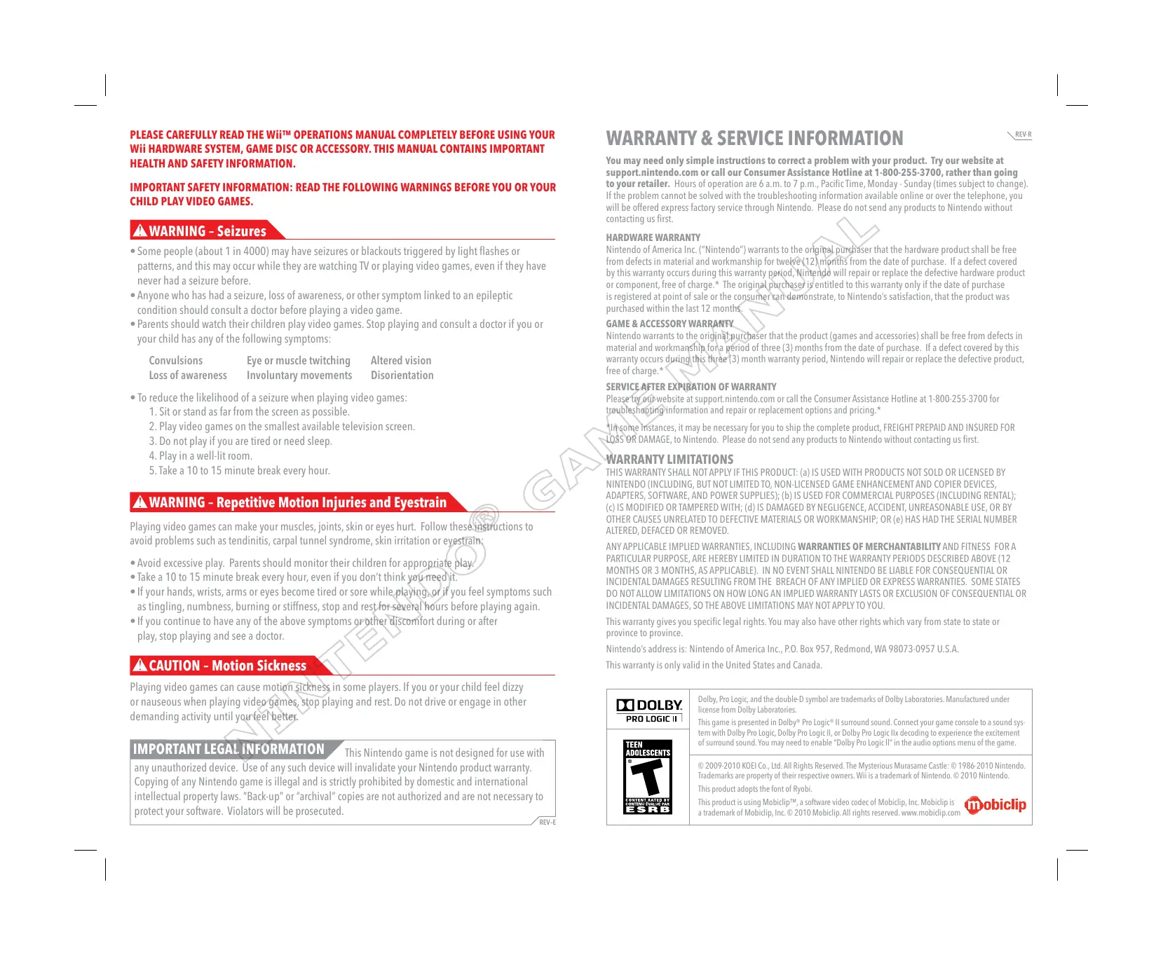 This game is presented in Dolby® Pro Logic® II surround sound. Connect your game console to a sound system with Dolby Pro Logic, Dolby Pro Logic II, or Dolby Pro Logic IIx decoding to experience the excitement of surround sound. You may need to enable “Dolby Pro Logic ll” in the audio options menu of the game. © 2009-2010 KOEI Co., Ltd. All Rights Reserved. The Mysterious Murasame Castle: © 1986-2010 Nintendo. Trademarks are property of their respective owners. Wii is a trademark of Nintendo. © 2010 Nintendo. This product adopts the font of Ryobi. This product is using Mobiclip™, a software video codec of Mobiclip, Inc. Mobiclip is a trademark of Mobiclip, Inc. © 2010 Mobiclip. All rights reserved. www.mobiclip.com