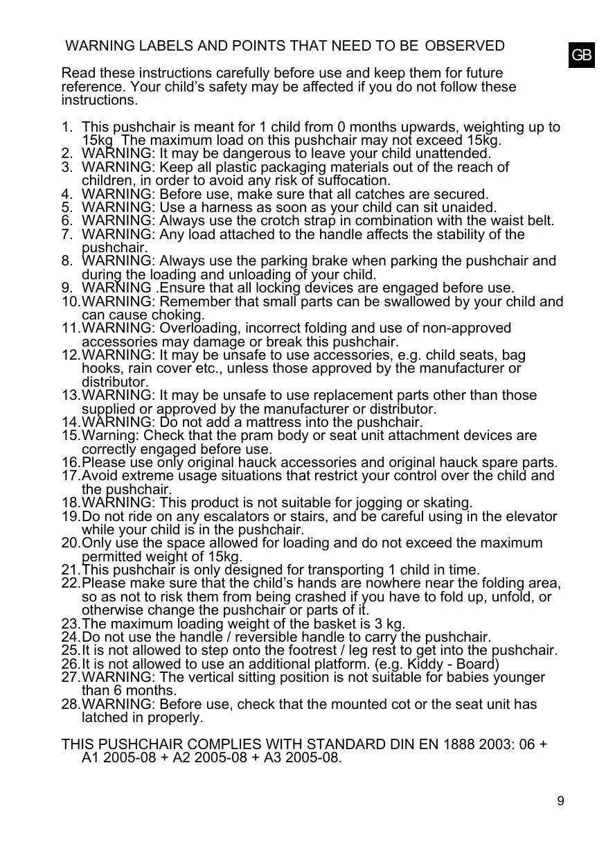 1. This pushchair is meant for 1 child from 0 months upwards, weighting up to 15kg The maximum load on this pushchair may not exceed 15kg. 2. WARNING: It may be dangerous to leave your child unattended. 3. WARNING: Keep all plastic packaging materials out of the reach of children, in order to avoid any risk of suffocation. 4. WARNING: Before use, make sure that all catches are secured. 5. WARNING: Use a harness as soon as your child can sit unaided. 6. WARNING: Always use the crotch strap in combination with the waist belt. 7. WARNING: Any load attached to the handle affects the stability of the pushchair. 8. WARNING: Always use the parking brake when parking the pushchair and during the loading and unloading of your child. 9. WARNING .Ensure that all locking devices are engaged before use. 10.WARNING: Remember that small parts can be swallowed by your child and can cause choking. 11.WARNING: Overloading, incorrect folding and use of non-approved accessories may damage or break this pushchair. 12.WARNING: It may be unsafe to use accessories, e.g. child seats, bag hooks, rain cover etc., unless those approved by the manufacturer or distributor. 13.WARNING: It may be unsafe to use replacement parts other than those supplied or approved by the manufacturer or distributor. 14.WARNING: Do not add a mattress into the pushchair. 15.Warning: Check that the pram body or seat unit attachment devices are correctly engaged before use. 16.Please use only original hauck accessories and original hauck spare parts. 17.Avoid extreme usage situations that restrict your control over the child and the pushchair. 18.WARNING: This product is not suitable for jogging or skating. 19.Do not ride on any escalators or stairs, and be careful using in the elevator while your child is in the pushchair. 20.Only use the space allowed for loading and do not exceed the maximum permitted weight of 15kg. 21.This pushchair is only designed for transporting 1 child in time. 22.Please make sure that the child’s hands are nowhere near the folding area, so as not to risk them from being crashed if you have to fold up, unfold, or otherwise change the pushchair or parts of it. 23. The maximum loading weight of the basket is 3 kg. 24.Do not use the handle / reversible handle to carry the pushchair. 25.It is not allowed to step onto the footrest / leg rest to get into the pushchair. 26.It is not allowed to use an additional platform. (e.g. Kiddy - Board) 27.WARNING: The vertical sitting position is not suitable for babies younger than 6 months. 28.WARNING: Before use, check that the mounted cot or the seat unit has latched in properly. THIS PUSHCHAIR COMPLIES WITH STANDARD DIN EN 1888 2003: 06 + A1 2005-08 + A2 2005-08 + A3 2005-08. 9