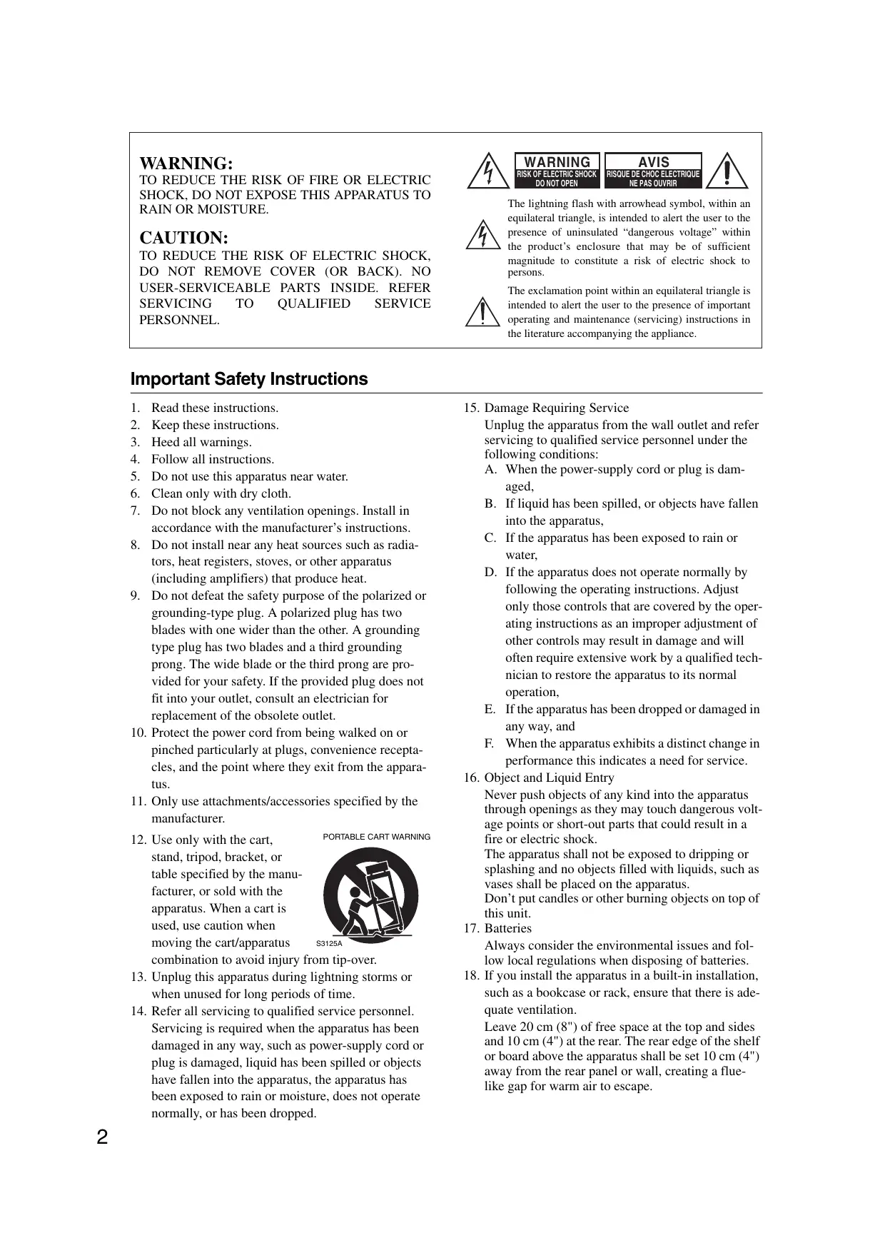 14. Refer all servicing to qualified service personnel. Servicing is required when the apparatus has been damaged in any way, such as power-supply cord or plug is damaged, liquid has been spilled or objects have fallen into the apparatus, the apparatus has been exposed to rain or moisture, does not operate normally, or has been dropped.