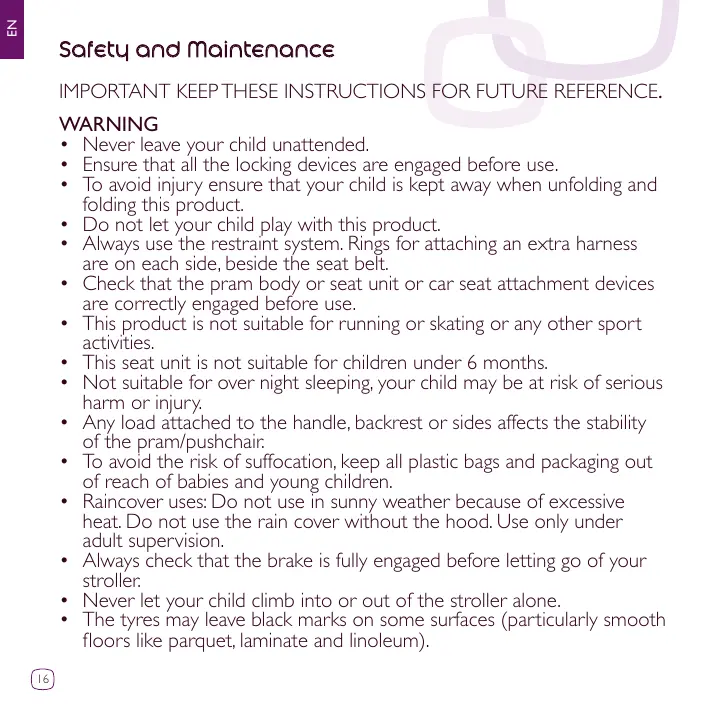 IMPORTANT KEEP THESE INSTRUCTIONS FOR FUTURE REFERENCE. WARNING • Never leave your child unattended. • Ensure that all the locking devices are engaged before use. • To avoid injury ensure that your child is kept away when unfolding and folding this product. • Do not let your child play with this product. • Always use the restraint system. Rings for attaching an extra harness are on each side, beside the seat belt. • Check that the pram body or seat unit or car seat attachment devices are correctly engaged before use. • This product is not suitable for running or skating or any other sport activities. • This seat unit is not suitable for children under 6 months. • Not suitable for over night sleeping, your child may be at risk of serious harm or injury. • Any load attached to the handle, backrest or sides affects the stability of the pram/pushchair. • To avoid the risk of suffocation, keep all plastic bags and packaging out of reach of babies and young children. • Raincover uses: Do not use in sunny weather because of excessive heat. Do not use the rain cover without the hood. Use only under adult supervision. • Always check that the brake is fully engaged before letting go of your stroller. • Never let your child climb into or out of the stroller alone. • The tyres may leave black marks on some surfaces (particularly smooth floors like parquet, laminate and linoleum). 16
