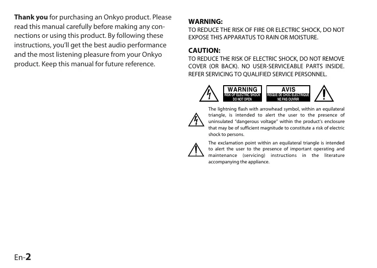 Ne touchez jamais cet appareil avec des mains mouillées—Ne manipulez jamais cet appareil ou son cordon d’alimentation avec des mains mouillées ou humides. Si de l’eau ou tout autre liquide pénètre à l’intérieur de l’appareil, faites-le vérifier par votre revendeur Onkyo.