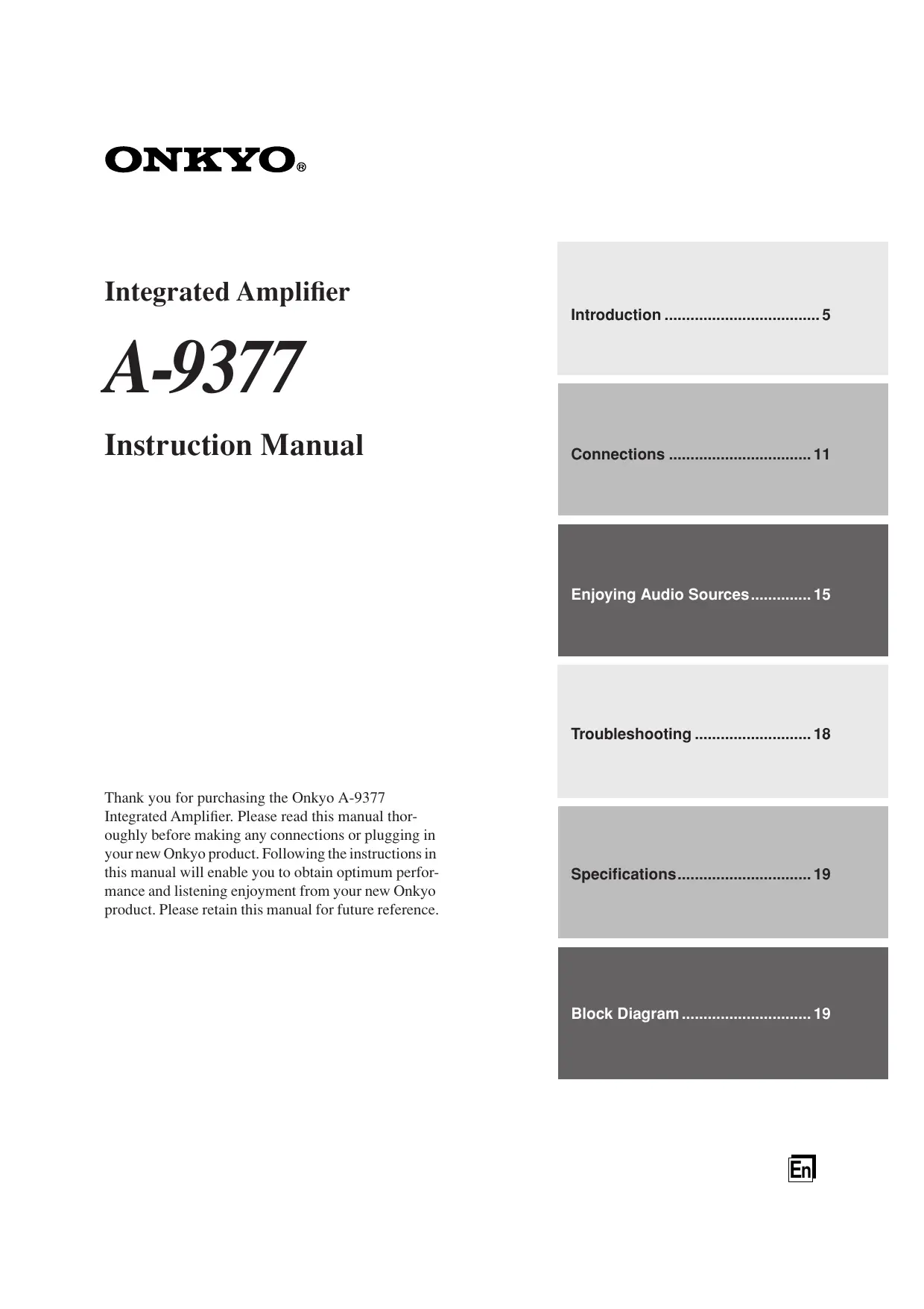 Download the instructions for your Amplificateur audio in PDF format for free! Find your manual A-9377 - ONKYO and take your electronic device back in hand. On this page are published all the documents necessary for the use of your device. A-9377 by ONKYO.