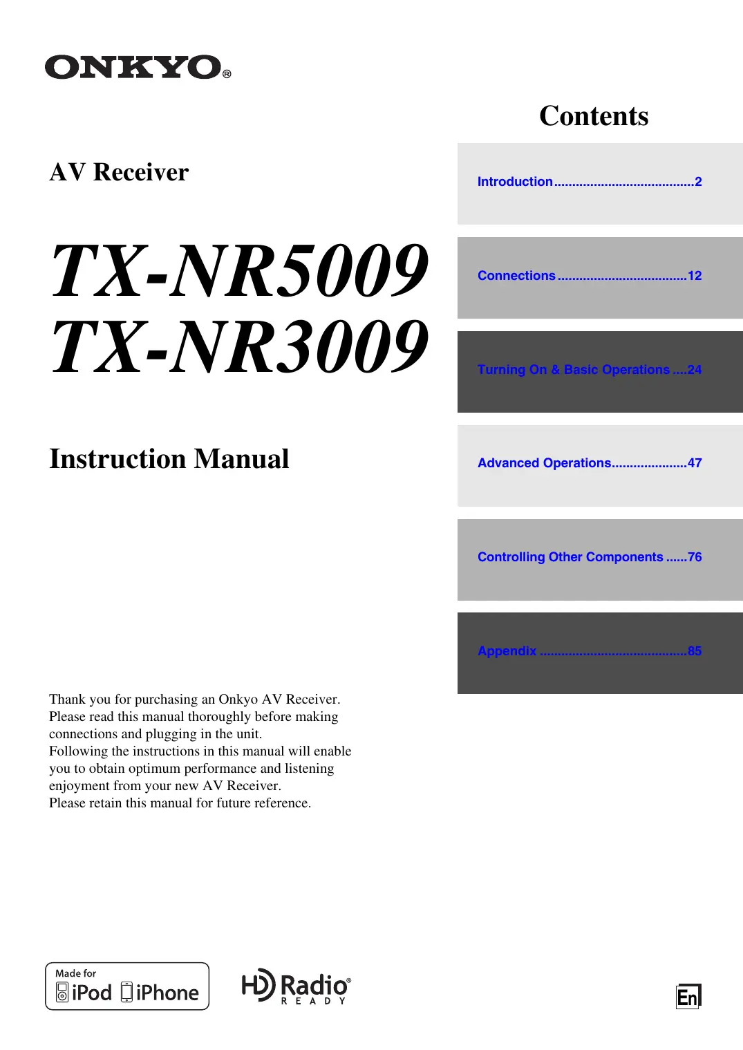 Thank you for purchasing an Onkyo AV Receiver. Please read this manual thoroughly before making connections and plugging in the unit.