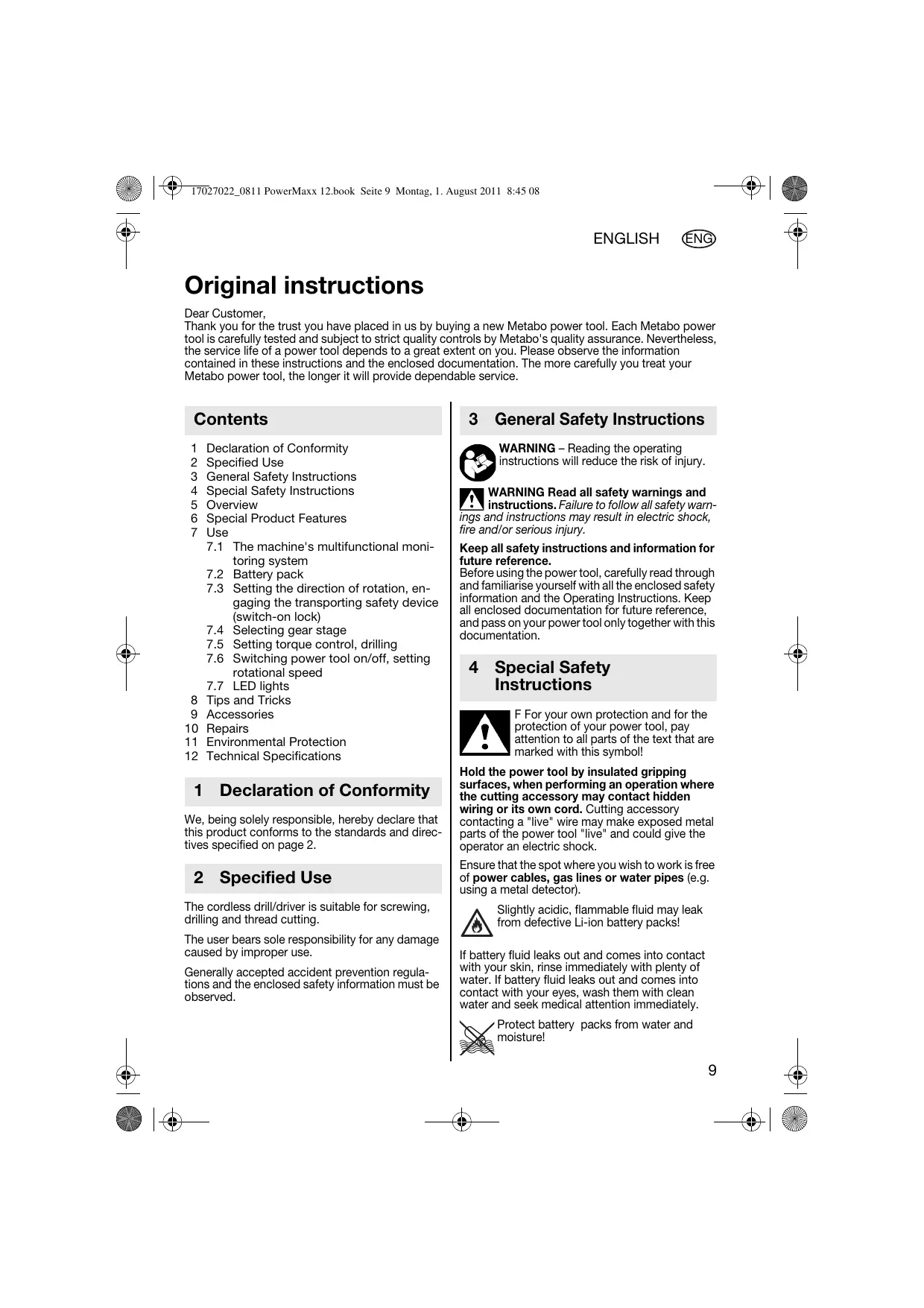 EN 60745 2006/42/EG, 2004/108/EG Volker Siegle Director Product Engineering & Quality Responsible Person for Documentation © 2011 Metabowerke GmbH, 72622 Nürtingen, Germany