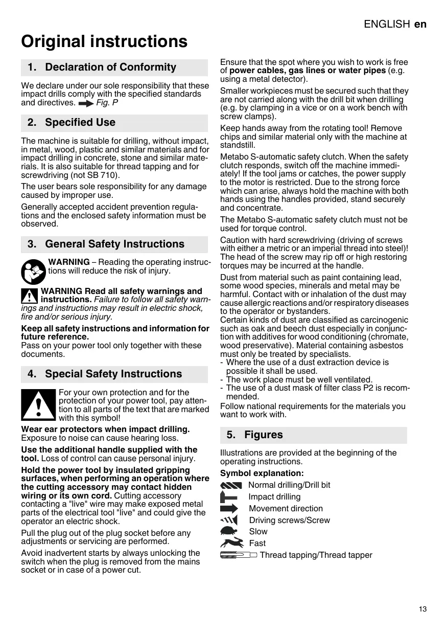 For your own protection and for the protection of your power tool, pay attention to all parts of the text that are marked with this symbol! Wear ear protectors when impact drilling. Exposure to noise can cause hearing loss. Use the additional handle supplied with the tool. Loss of control can cause personal injury. Hold the power tool by insulated gripping surfaces, when performing an operation where the cutting accessory may contact hidden wiring or its own cord. Cutting accessory contacting a "live" wire may make exposed metal parts of the electrical tool "live" and could give the operator an electric shock. Pull the plug out of the plug socket before any adjustments or servicing are performed. Avoid inadvertent starts by always unlocking the switch when the plug is removed from the mains socket or in case of a power cut. Ensure that the spot where you wish to work is free of power cables, gas lines or water pipes (e.g. using a metal detector). Smaller workpieces must be secured such that they are not carried along with the drill bit when drilling (e.g. by clamping in a vice or on a work bench with screw clamps). Keep hands away from the rotating tool! Remove chips and similar material only with the machine at standstill. Metabo S-automatic safety clutch. When the safety clutch responds, switch off the machine immediately! If the tool jams or catches, the power supply to the motor is restricted. Due to the strong force which can arise, always hold the machine with both hands using the handles provided, stand securely and concentrate. The Metabo S-automatic safety clutch must not be used for torque control. Caution with hard screwdriving (driving of screws with either a metric or an imperial thread into steel)! The head of the screw may rip off or high restoring torques may be incurred at the handle. Dust from material such as paint containing lead, some wood species, minerals and metal may be harmful. Contact with or inhalation of the dust may cause allergic reactions and/or respiratory diseases to the operator or bystanders. Certain kinds of dust are classified as carcinogenic such as oak and beech dust especially in conjunction with additives for wood conditioning (chromate, wood preservative). Material containing asbestos must only be treated by specialists. - Where the use of a dust extraction device is possible it shall be used. - The work place must be well ventilated. - The use of a dust mask of filter class P2 is recommended. Follow national requirements for the materials you want to work with.