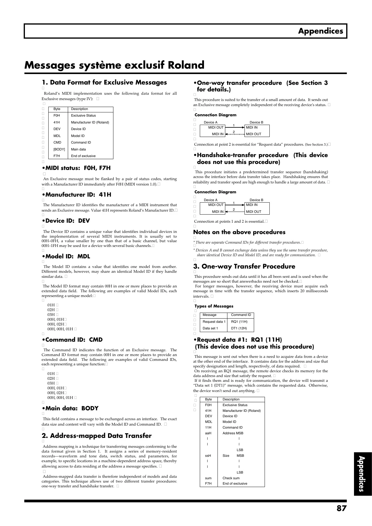 - Request data #1: RQ1 (11H) (This device does not use this procedure) This message is sent out when there is a need to acquire data from a device at the other end of the interface. It contains data for the address and size that specify designation and length, respectively, of data required. On receiving an RQ1 message, the remote device checks its memory for the data address and size that satisfy the request. If it finds them and is ready for communication, the device will transmit a “Data set 1 (DT1)” message, which contains the requested data. Otherwise, the device won't send out anything. Byte Description F0H Exclusive Status 41H Manufacturer ID (Roland) DEV Device ID MDL Model ID 11H Command ID aaH Address MSB