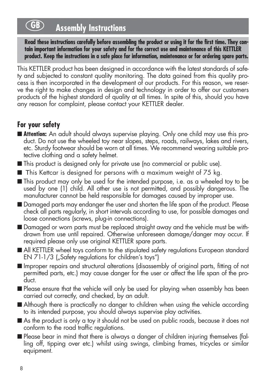 Attention: An adult should always supervise playing. Only one child may use this product. Do not use the wheeled toy near slopes, steps, roads, railways, lakes and rivers, etc. Sturdy footwear should be worn at all times. We recommend wearing suitable protective clothing and a safety helmet. This product is designed only for private use (no commercial or public use). This Kettcar is designed for persons with a maximum weight of 75 kg. This product may only be used for the intended purpose, i.e. as a wheeled toy to be used by one (1) child. All other use is not permitted, and possibly dangerous. The manufacturer cannot be held responsible for damages caused by improper use. Damaged parts may endanger the user and shorten the life span of the product. Please check all parts regularly, in short intervals according to use, for possible damages and loose connections (screws, plug-in connections). Damaged or worn parts must be replaced straight away and the vehicle must be withdrawn from use until repaired. Otherwise unforeseen damage/danger may occur. If required please only use original KETTLER spare parts. All KETTLER wheel toys conform to the stipulated safety regulations European standard EN 71-1/3 („Safety regulations for children’s toys“) Improper repairs and structural alterations (disassembly of original parts, fitting of not permitted parts, etc.) may cause danger for the user or affect the life span of the product. Please ensure that the vehicle will only be used for playing when assembly has been carried out correctly, and checked, by an adult. Although there is practically no danger to children when using the vehicle according to its intended purpose, you should always supervise play activities. As the product is only a toy it should not be used on public roads, because it does not conform to the road traffic regulations. Please bear in mind that there is always a danger of children injuring themselves (falling off, tipping over etc.) whilst using swings, climbing frames, tricycles or similar equipment. 8