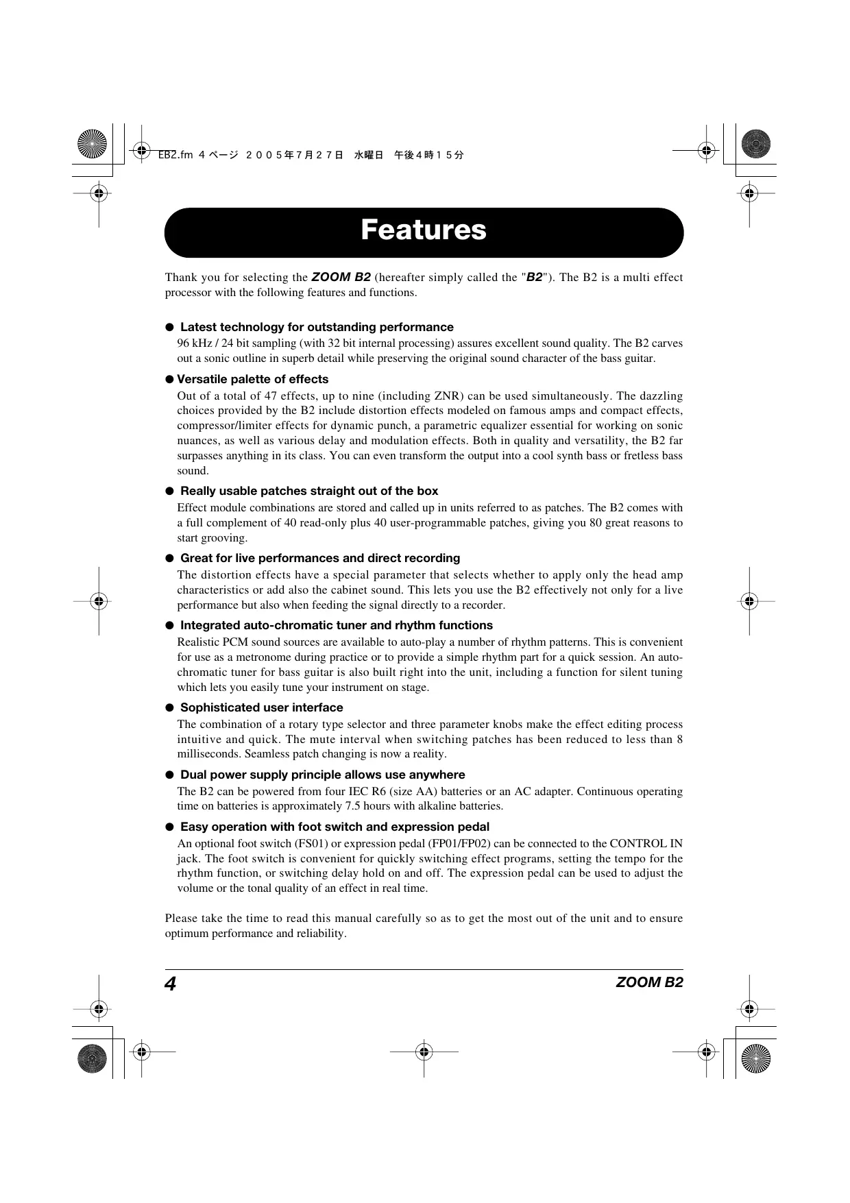 din sa 2005#7R27H AE FHkAM154 4. 1 Thank you for selecting the ZOOM B2 (hereafter simply called the "B2"). The B2 is a multi effect processor with the following features and functions. © Latest technology for outstanding performance 96 kHz / 24 bit sampling (with 32 bit internal processing) assures excellent sound quality. The B2 carves out a sonic outline in superb detail while preserving the original sound character of the bass © Versatile palette of effects Out of a total of 47 effects, up to nine (including ZNR) can be used simultaneously. The dazzling choices provided by the B2 include distortion effects modeled on famous amps and compact effects, or/limiter effects for dynamic punch, a parametric equalizer essential for working on sonic s, as well as various delay and modulation effects. Both in quality and versatility, the B2 far surpasses anything in its class. You can even transform the output into a cool synth bass or fretless bass sound. © Really usable patches straight out of the box Effect module combinations are stored and called up in units referred to as patches. The B2 comes with à full complement of 40 read-only plus 40 user-programmable patches, giving you 80 great reasons to start grooving © Great for live performances and direct recording The distortion effects have a special parameter that selects whether to apply only the head amp characteristics or add also the cabinet sound. This lets you use the B2 effectively not only for a live performance but also when feeding the signal directly to a recorder. © Integrated auto-chromatic tuner and rhythm functions Realistic PCM sound sources are available to auto-play a number of rhythm patterns. This is convenient à metronome during practice or to provide a simple rhythm part for a quick session. An auto- chromatic tuner for bass guitar is also built right into the unit, including a function for silent tuni which lets you easily tune your instrument on stage © Sophisticated user interface The combination of a rotary type selector and three parameter knobs make the effect editing process intuitive and quick. The mute interval when switching patches has been reduced to less than 8 milliseconds. Seamless patch changing is now a reality. © Dual power supply principle allows use anywhere The B2 can be powered from four IEC R6 (size AA) batteries or an AC adapter. Continuous operating time on batteries is approximately 7.5 hours with alkaline batteries. © Easy operation with foot switch and expression pedal An optional foot switch (FS01) or expression pedal (FPO1/FP02) can be connected to the CONTROL IN jack. The foot switch is convenient for quickly switching effect programs, setting the tempo for the rhythm function, or switching delay hold on and off. The expression pedal can be used to adjust the volume or the tonal quality of an effect in real time Please take the time to read this manual carefully so as to get the most out of the unit and to ensure optimum performance and reliability. 4 ZOOM B2