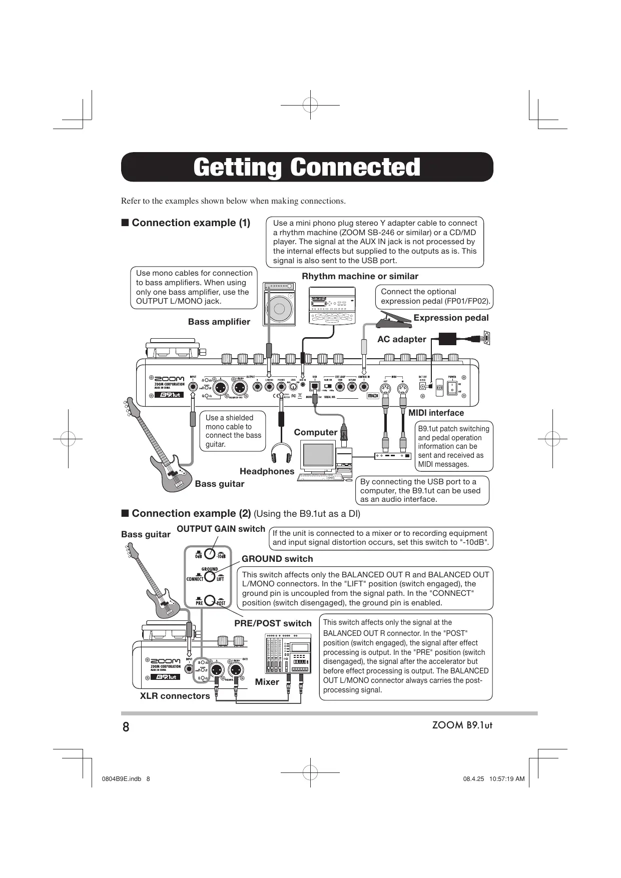 O804BSEindb 8 Getting Connected Refer to the examples shown below when making connections. HE Connection example (1) Use a mini phono plug stereo Y adapter cable to connect a rhythm machine (ZOOM SB-246 or similar) or a CD/MD player. The signal at the AUX IN jack is not processed by the internal effects but supplied to the outputs as is. This signal is also sent to the USB port. Use mono cables for connection to bass amplifiers. When using only one bass amplifier, use the OUTPUT L/MONO jack. Rhythm machine or similar Connect the optional expression pedal (FP01/FP0; a Psion pedal AC adapter Bass amplifier Use a shielded mono cable to connect the bass B9.tut patch switching and pedal operation information can be pr == ca) | sent and received as MIDI messages. By connecting the USB port to a computer, the B9.ut can be used as an audio interface. HE Connection example (2) (Using the B9.1ut as a DI) OUTPUT GAIN switch ( fthe unit is connected to a mixer or to recording ss) Bass guitar and input signal distortion occurs, set this switch to "-10dB: GROUND switch This switch affects only the BALANCED OUT R and BALANCED OUT L/MONO connectors. In the "LIFT" position (switch engaged), the ground pin is uncoupled from the signal path. In the "CONNECT" position (switch disengaged), the ground pin is enabled. This switch affects only the signal at the BALANCED OUT R connector. In the "POST" position (switch engaged), the signal after effect processing is output. In the *PRE* position (switch disengaged), the signal after the accelerator but before effect processing is output. The BALANCED OUT L/MONO connector always carries the post- processing signal. 8 ZOOM B9.lut