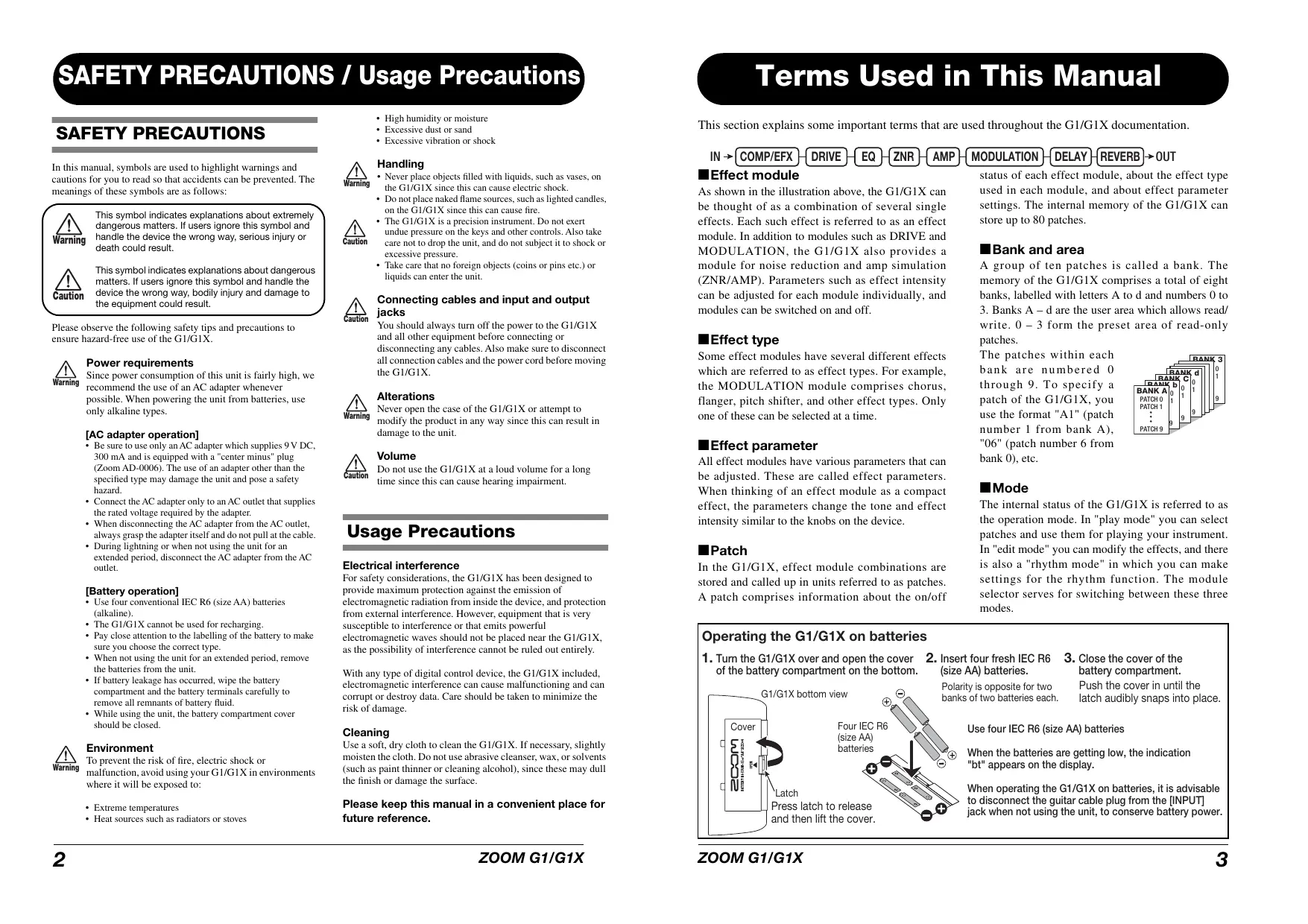 Thank you for selecting the ZOOM G1/G1X (hereafter simply called the "G1/G1X"). Please take the time to read this manual carefully to get the most out of this product and to ensure optimum performance and reliability.