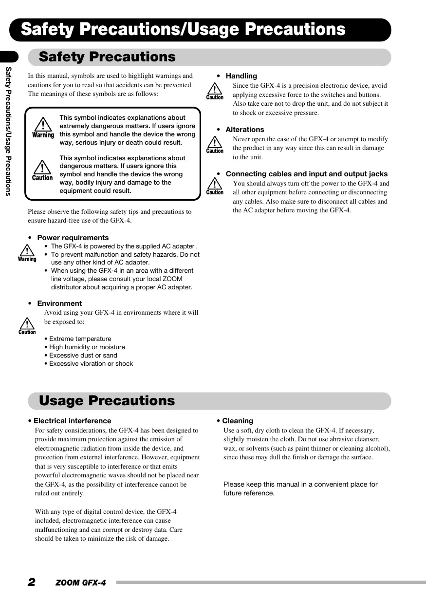 This symbol indicates explanations about to the unit. dangerous matters. If users ignore this Éfon SymMbol and handle the device the wrong + _Connecting cables and input and output jacks way, bodily injury and damage to the You should always turn off the power to the GFX-4 and equipment could result. on all other equipment before connecting or disconnecting any cables. Also make sure to disconnect all cables and Please observe the following safety tips and precautions to the AC adapter before moving the GFX-4. ensure hazard-free use of the GFX-4. + Power requirements +_The GFX-4 is powered by the supplied AC adapter Amy T° prevent malfunction and safety hazards, Do not use any other kind of AC adapter. + When using the GFX-4 in an area with a different line voltage, please consult your local ZOOM distributor about acquiring a proper AC adapter. + Environment Avoid using your GFX-4 in environments where it will À be exposed 10: Gex + Extreme temperature + High humidiy or moisture + Excessive dust or sand + Excessive vibration or shock Usage Precautions + Electrical interference + Cleaning For safety considerations, the GFX-4 has been designed to Use a soft, dry cloth to clean the GFX-4. If necessary, provide maximum protection against the emission of slightly moisten the cloth. Do not use abrasive cleanser, electromagnetic radiation from inside the device, and wax, or solvents (such as paint thinner or cleaning alcohol), powerful electromagnetic waves should not be placed near the GFX-4, as the possibility of interference cannot be Please keep this manual in a convenient place for ruled out entirely future reference. With any type of digital control device, the GFX-4
