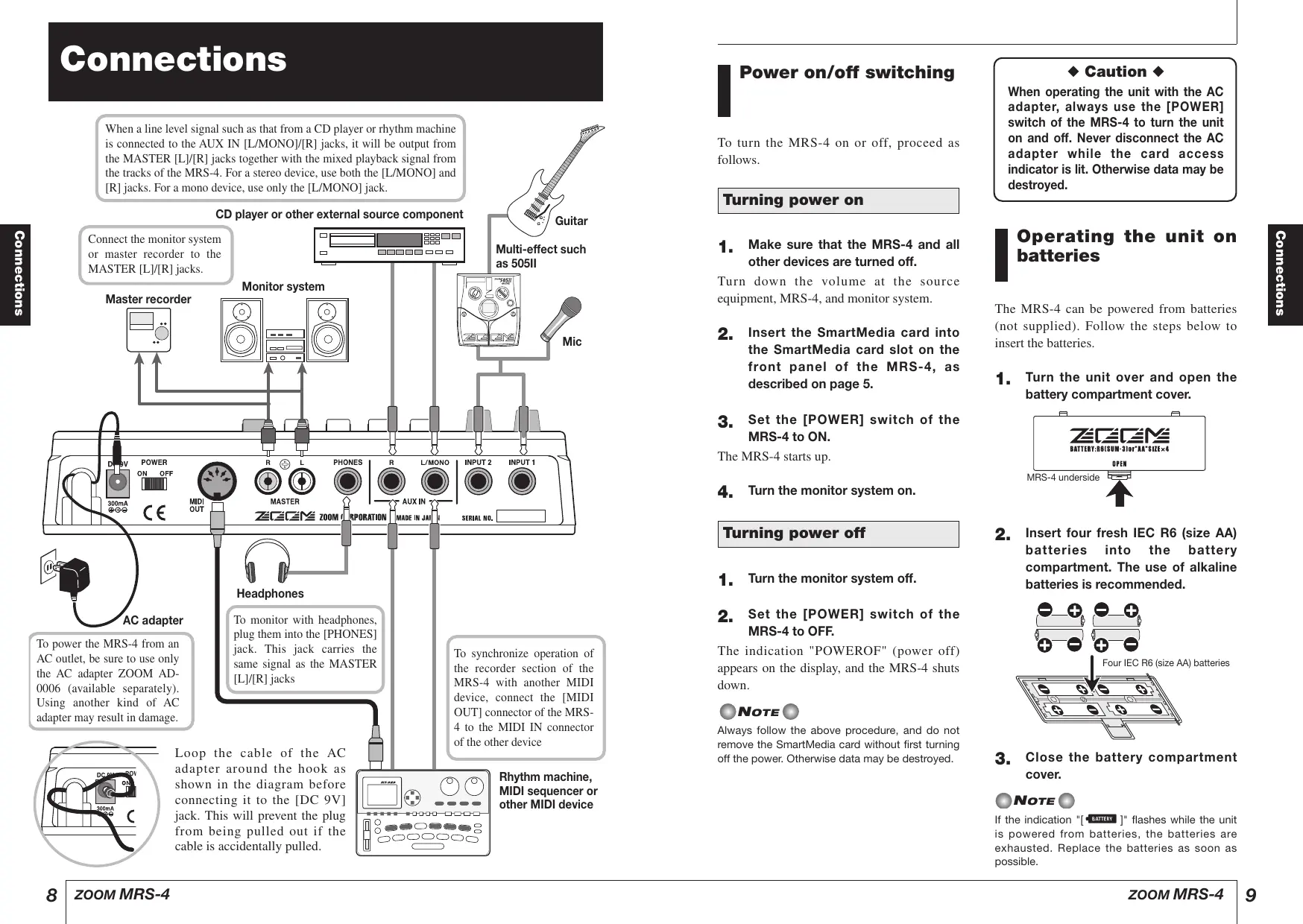 MRS-4 to OFF. The indication "POWEROF" (power off) appears on the display, and the MRS-4 shuts down. ONore © Always follow the above procedure, and do not remove the SmartMedia card without first turning off the power. Otherwise data may be destroyedi + Caution + When operating the unit with the AC adapter, always use the [POWER] switch of the MRS-4 to turn the unit on and off. Never disconnect the AC adapter while the card access indicator is lit. Otherwise data may be destroyed. Operating the unit on batteries The MRS-4 can be powered from batteries {not supplied). Follow the steps below to insert the batteries.