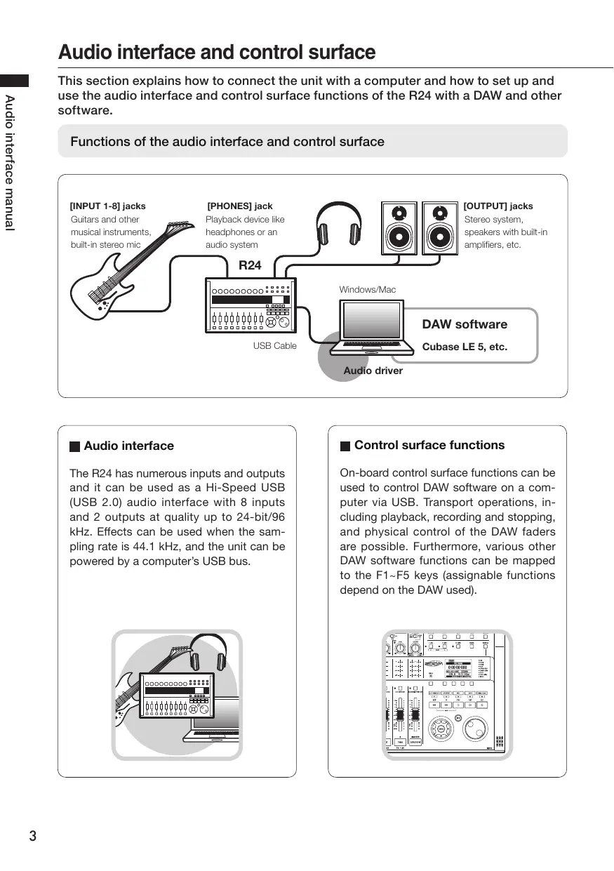 USB Cable Let (—— Windows/Mac bn DAW software Cubase LE 5, etc. Audio driver M Audio interface The R24 has numerous inputs and outputs and it can be used as a Hi-Speed USB {USB 2.0) audio interface with 8 inputs and 2 outputs at quality up to 24-bit/96 kHz. Effects can be used when the sam- pling rate is 44.1 kHz, and the unit can be powered by a computer's USB bus.