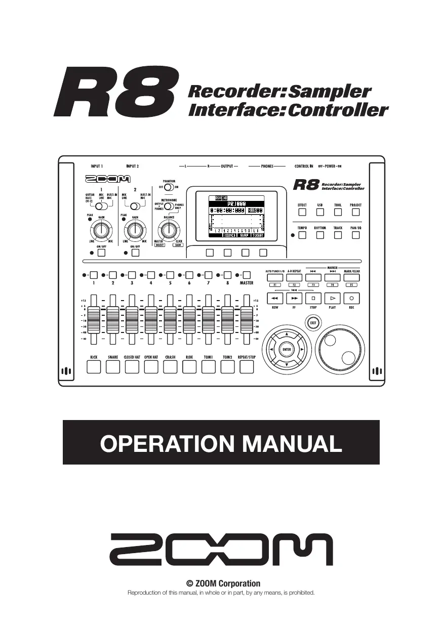 Please read through this manual carefuly in order to understand the functions of the RR& vel Introduction 0 that you can use it happy for many years. After reading through this manual please keep it along with the warranty n a safe place. Please note hat some detais might be changed without notice h order to improve the product. Thank you very much for purchasing the ZOOM Æ&, which we will refer to as the Æ& in this manual. The A8 has the following features. = Multitrack recorder that can use up to 32 GB SDHC cards The A8 can is an 8-track recorder that supports SDHC cards of up to 32 GB. After making linear PCM recordings (WAV format) at 16/24-bit and 44.1/48kHz sampling rate, you can transfer recorded files to your computer to use them in DAW software. = Hi-Speed USB 2.0 audio interface You can use the R& and its various input and output jacks as a Hi-speed USB 2.0 audio interface that can handle 2 inputs and 2 outputs at up to 24-bit and 96 kHz. is effects can even be used (at 44.1 kHz only) and it can also operate using USB bus power. (See the Audio Interface Manual on the ide SD card for etais) = DAW software control surface The R& can be connected to a computer by USB cable and used as a control surface for DAW software. You can operate transport functions, including play, record and stop keys and physically control onscreen faders. You can also assign various DAW functions to the F1-F5 function keys. (The assignable functions depend on the DAW software.) {See the Audio Interface Manual on the induded SD card for details) = Handies a variety of input sources including guitars, microphones and line-level equipment The AS has 2 input jacks that accept both XLR and standard phone connectors. Both can supply phantom power (24 or 48 V) and one can handle high-impedance input. In addition to high- impedance guitars and basses, the inputs can handle al types of sources, including dynamic and condenser microphones, synthesizers and other line level instruments. The built-in high- performance microphones are convenient for recording acoustic guitars and vocals. (See “Connecing instruments” on P21) = Sampler with 8 pads and 8 voices Use the sampler to assign sounds to each track (pad) and create loops. Play the pads in real- time, and combine loops to create performances for a complete song. By simply lining up drum loops from the included SD card, anyone can easily create professional-quality backing parts and basic tracks. The recorder and sampler work together seamlessiy, so you can record audio on other tracks while listening to loop playback. (See “Usg the samplr to make songs” on 60)