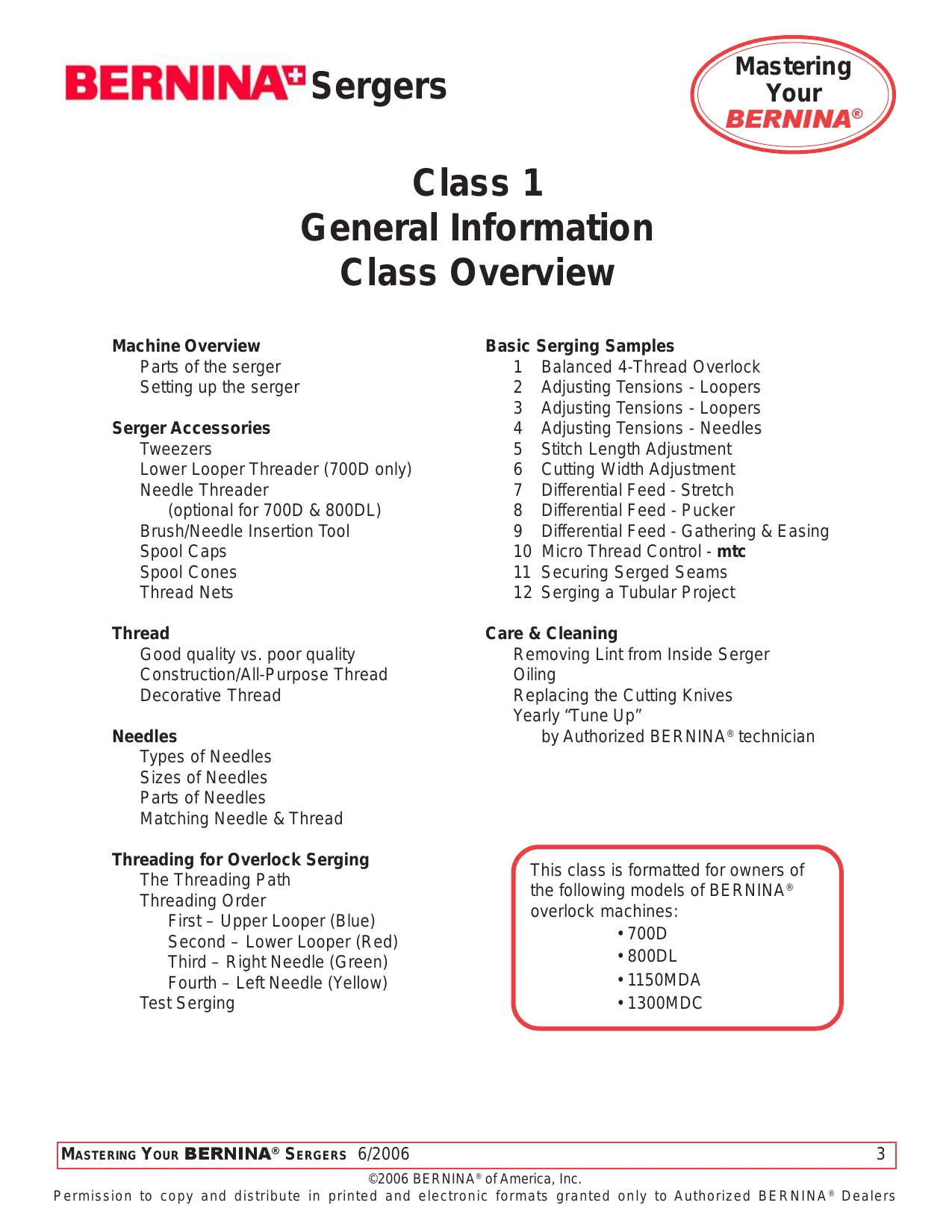 - Masteri BERNINA Sergers “our Table of Contents Class 1 - General Information p. 3