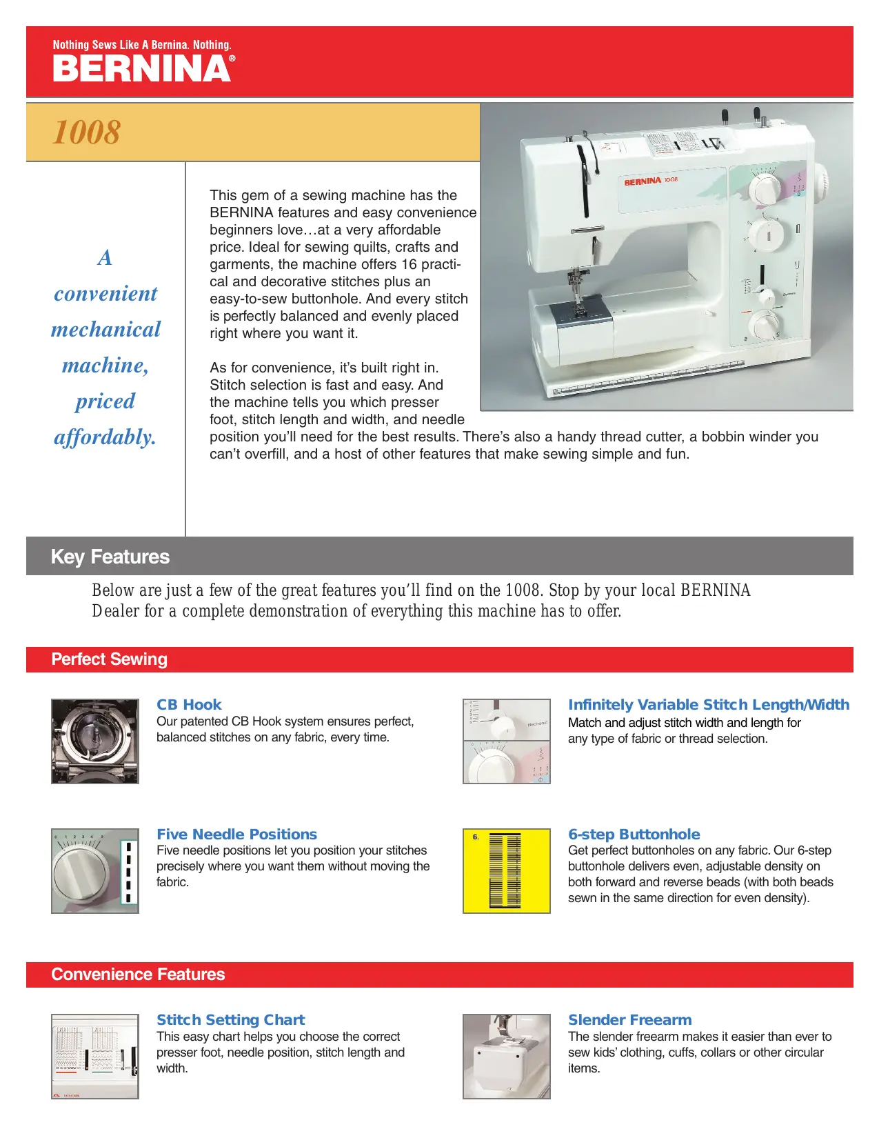 convenient mechanical machine, priced affordably. Nothing Sews Like A Bernina. Nothing. BERNINA This gem of a sewing machine has the BERNINA features and easy convenience beginners love.….at a very affordable price. Ideal for sewing quilts, crafts and garments, the machine offers 16 practi- cal and decorative stitches plus an easy-to-sew buttonhole. And every stitch is perfectly balanced and evenly placed right where you want it. As for convenience, it's built right in. Stitch selection is fast and easy. And the machine tells you which presser foot, stitch length and width, and needle position you'll need for the best results. There's also a handy thread cutter, a bobbin winder you can't overfill, and a host of other features that make sewing simple and fun. Key Features Below are just a few of the great features you’Il find on the 1008. Stop by your local BERNINA Dealer for a complete demonstration of everything this machine has to offer. Perfect Sewing CB Hook Infinitely Variable Stitch Length/Width Our patented CB Hook system ensures perfect, | Match and adjust stitch width and length for balanced stitches on any fabric, every time. - 7 any type of fabric or thread selection. PS È : à 1 Five Needle Positions 6-step Buttonhole Five needle positions let you position your stitches Get perfect buttonholes on any fabric. Our 6-step precisely where you want them without moving the buttonhole delivers even, adjustable density on fabric. both forward and reverse beads (with both beads sewn in the same direction for even density). Convenience Features width. Stitch Setting Chart This easy chart helps you choose the correct presser foot, needle position, stitch length and Slender Freearm The slender freearm makes it easier than ever to sew kids’ clothing, cuffs, collars or other circular items.