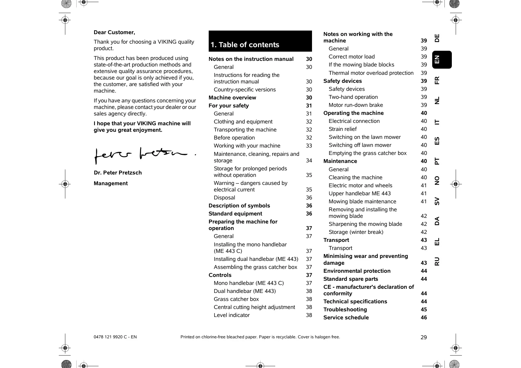 General Instructions for reading the instruction manual Country-specific versions Machine overview For your safety General Clothing and equipment Transporting the machine Before operation Working with your machine Maintenance, cleaning, repairs and storage Storage for prolonged periods without operation Warning – dangers caused by electrical current Disposal Description of symbols Standard equipment Preparing the machine for operation General Installing the mono handlebar (ME 443 C) Installing dual handlebar (ME 443) Assembling the grass catcher box Controls Mono handlebar (ME 443 C) Dual handlebar (ME 443) Grass catcher box Central cutting height adjustment Level indicator