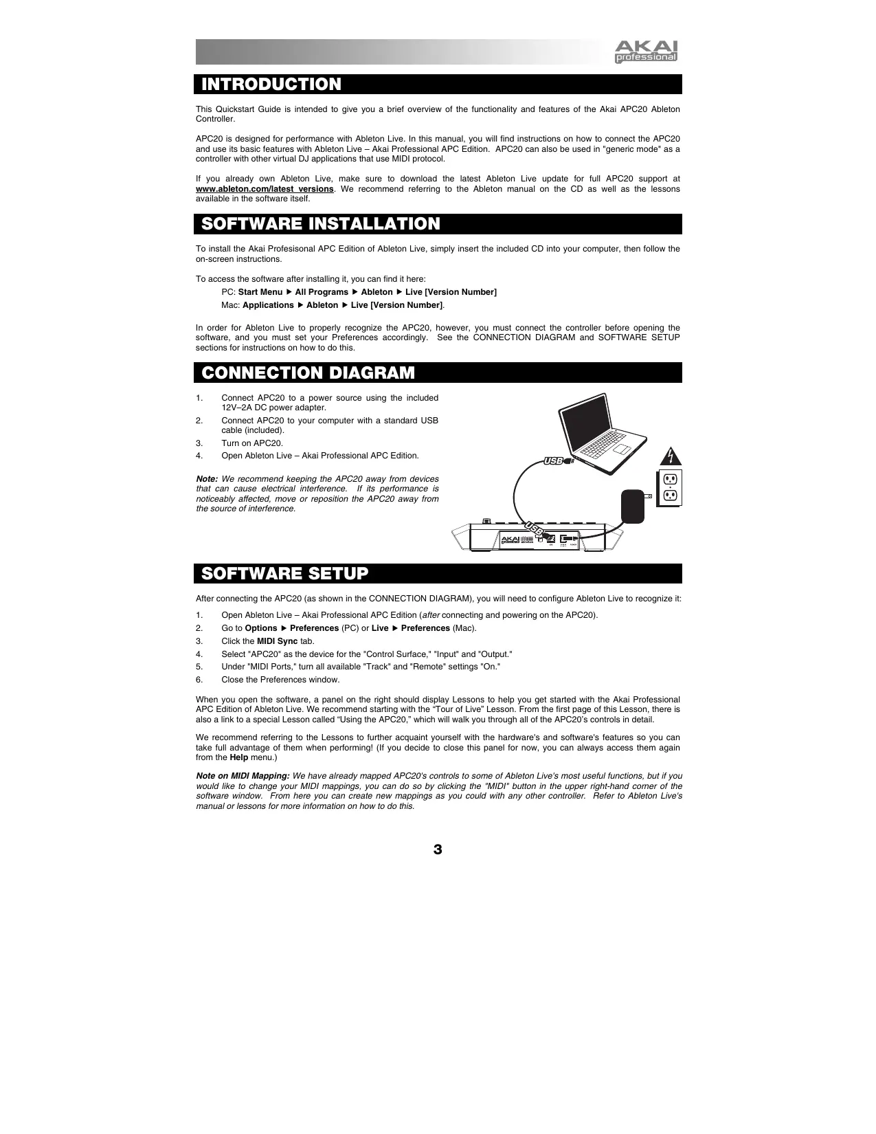 APC20 is designed for performance with Ableton Live. In this manual, you wall find instructions on how to connect the APC20 and use its basic features with Ableton Live — Akai Professional APC Edition. APC20 can also be used in "generic mode” as a controller with other virtual DJ applications that use MIDI protocol.