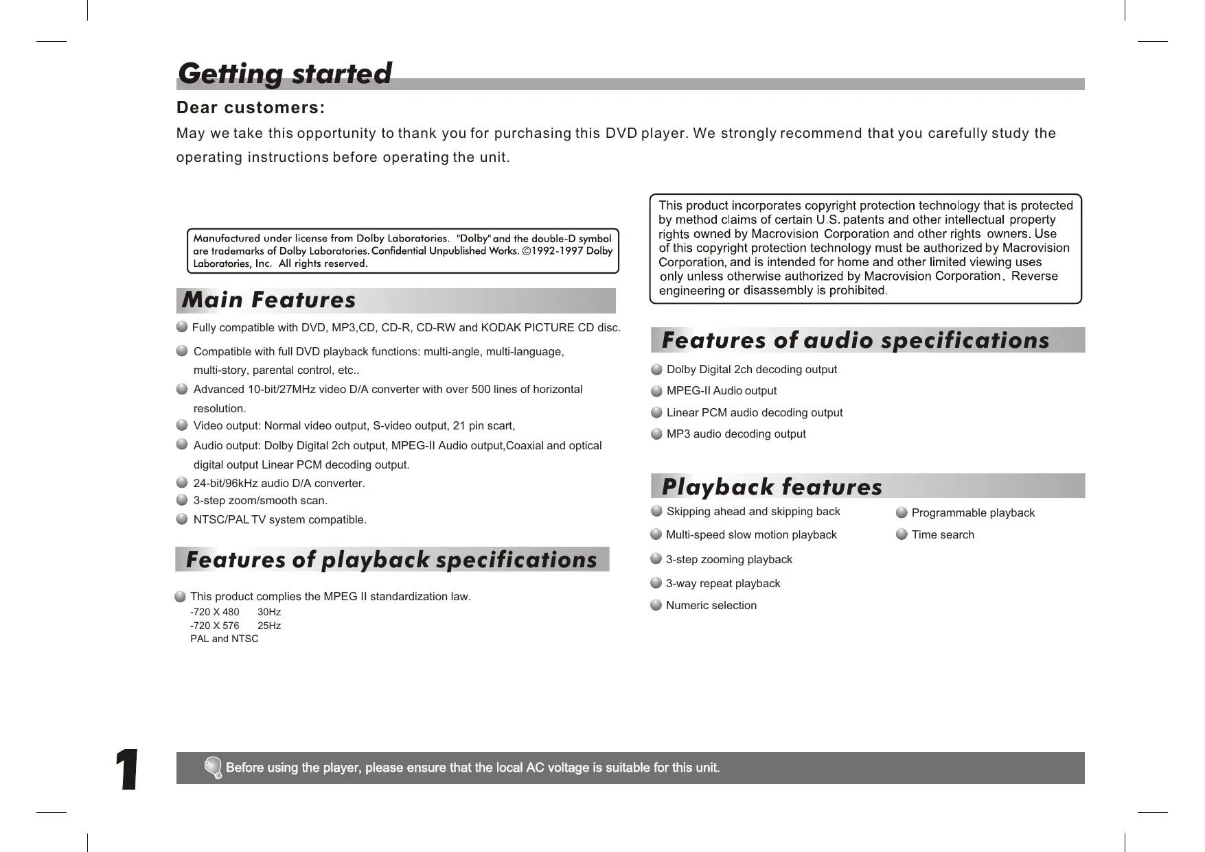 Getting.starte ds Dear customers: May we take this opportunity to thank you for purchasing this DVD player. We strongly recommend that you carefully study the operating instructions before operating the unit. are trademarks of Dolby Laboratories. Confidential Unpublished Works. ©1992-1997 Dolby Laboratories, Inc. All rights reserved. Main Features © Fully compatible with DVD, MP3,CD, CD-R, CD-RW and KODAK PICTURE CD disc. © Compatible with full DVD playback functions: multi-angle, mult-language, multi-story, parental control, etc. © Advanced 10-bit/27MHz video D/A converter with over 500 lines of horizontal resolution. © Video output: Normal video output, S-video output, 21 pin scart, © Audio output: Dolby Digital 2ch output, MPEG-II Audio output, Coaxial and optical digital output Linear PCM decoding output. © 24-bit96kHz audio D/A converter. © 3:step zoom/smooth scan. © NTSC/PAL TV system compatible. UFeatures of playback specificationsa © This product complies the MPEG I! standardization law. -720X 480 30Hz -720X576 25Hz PAL and NTSC ing the player, please ensure that the local AC voltage Manufactured under license from Dolby Laboratories. "Dolby" and the double-D symbol | This product incorporates copyright protection technology that is protected by method claims of certain U.S. patents and other intellectual property rights owned by Macrovision Corporation and other rights owners. Use of this copyright protection technology must be authorized by Macrovision Corporation, and is intended for home and other limited viewing uses only unless otherwise authorized by Macrovision Corporation. Reverse engineering or disassembly is prohibited. UFeatures of audio specifications = © Dolby Digital 2ch decoding output © MPEG-II Audio output © Linear PCM audio decoding output © MP3 audio decoding output © Programmable playback Playback features © Skipping ahead and skipping back © Multi-speed slow motion playback © Time search © 3-step zooming playback © 3-way repeat playback © Numeric selection
