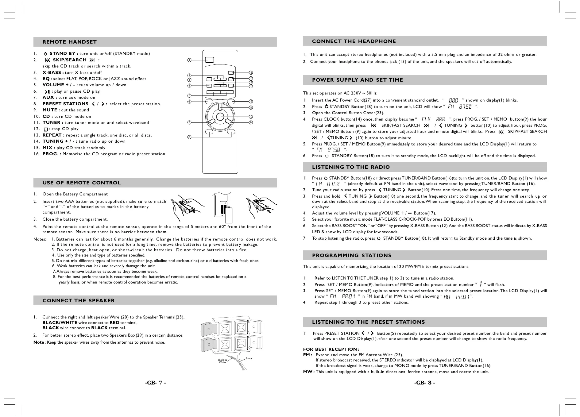 FOR BEST RECEPTION : FM: Extend and move the FM Antenna Wire (25) Ifstereo broadcast received, the STEREO indicator will be displayed at LCD Display(1). Ifthe broadcast signal is weak, change to MONO mode by press TUNER/BAND Button(16) MW: This unit is equipped with a built-In directional ferrite antenna, move and rotate the unit