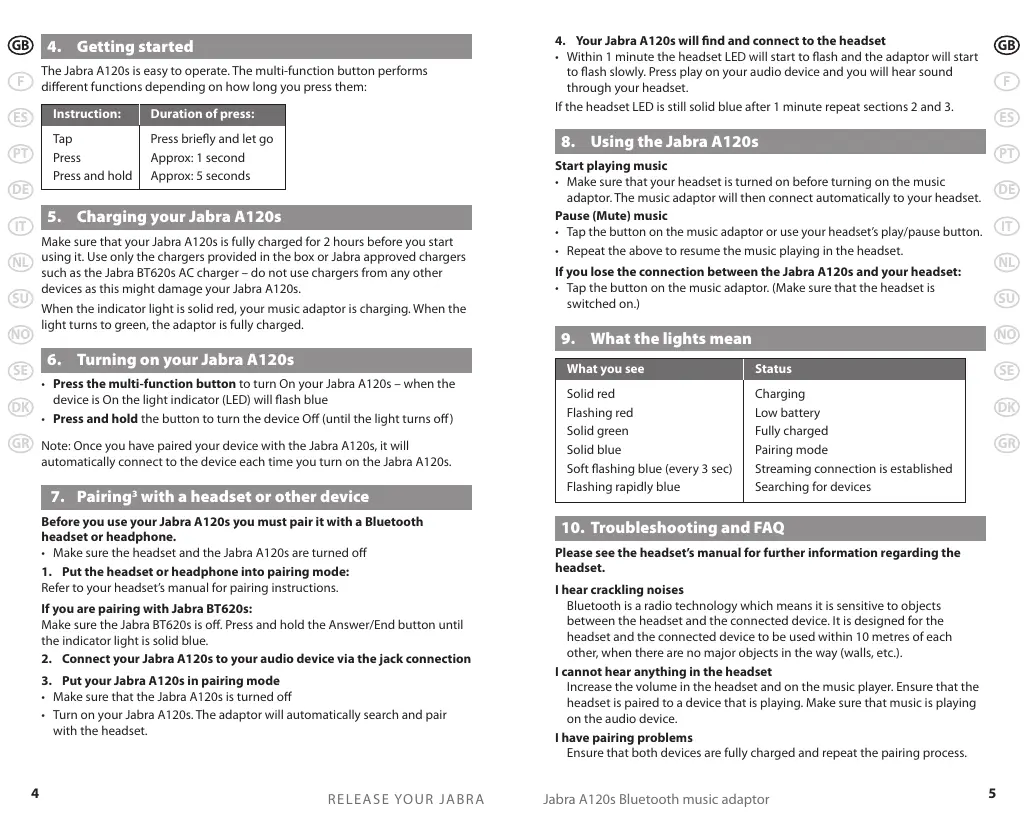 GR Thank you for purchasing the Jabra A120s Bluetooth® music adaptor. We hope you enjoy it! You will discover a new way of enjoying your music – wirelessly!