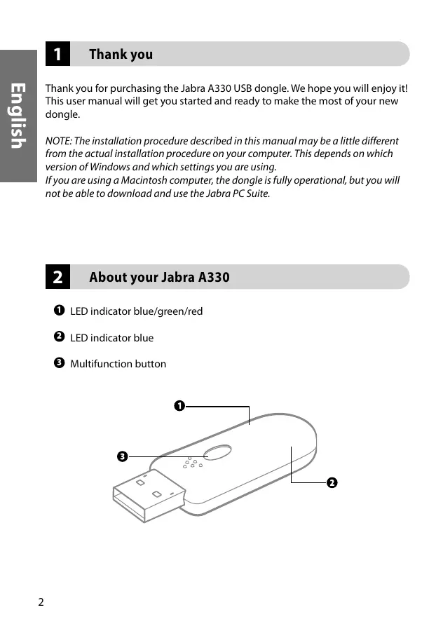 Thank you for purchasing the Jabra A330 USB dongle. We hope you will enjoy it! This user manual will get you started and ready to make the most of your new dongle.
