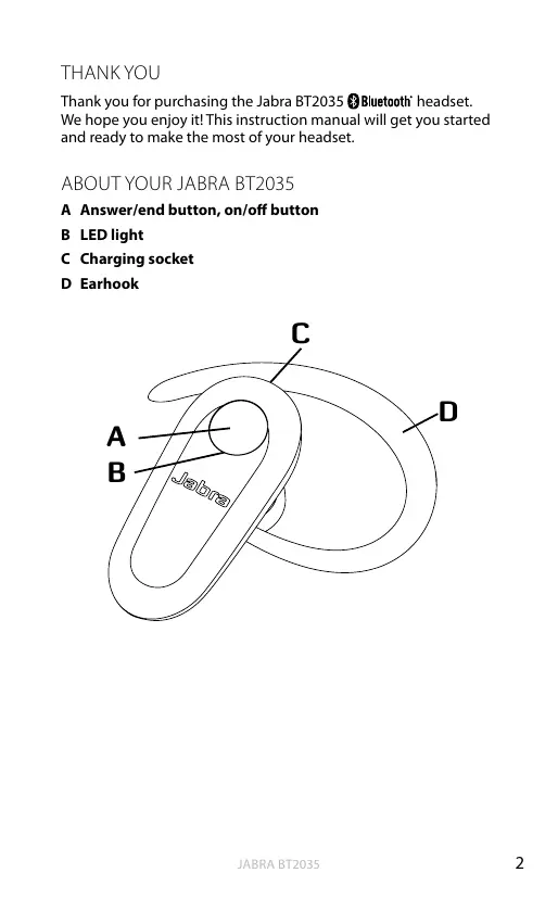 Thank you for purchasing the Jabra BT2035 headset. We hope you enjoy it! This instruction manual will get you started and ready to make the most of your headset.