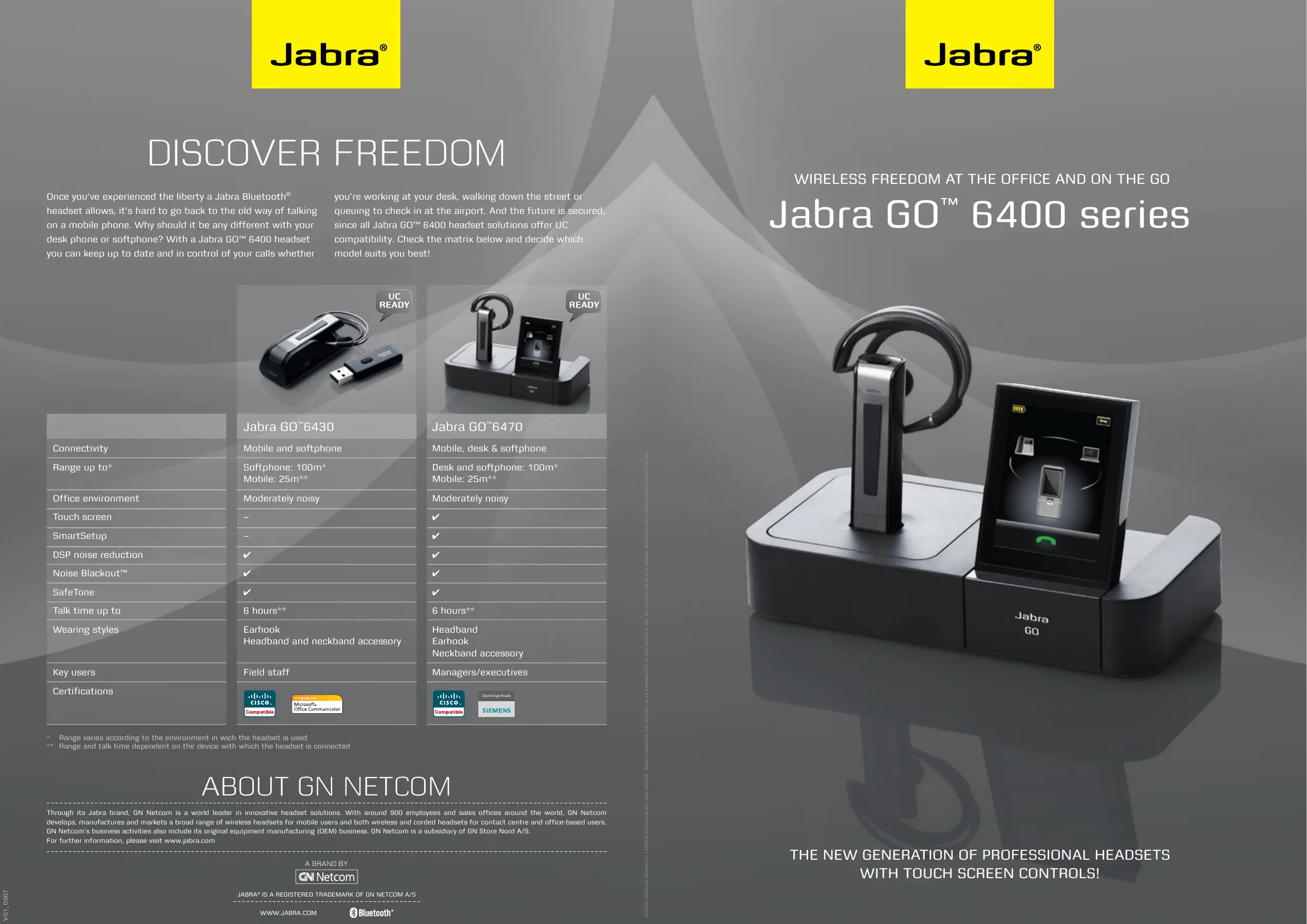 SHARPEN YOUR SENSES Jabra GO" 6400 series is the first office headset that integrates hearing, sight and touch to improve your communication. An exciting line-up of new features enhance the user-experience.