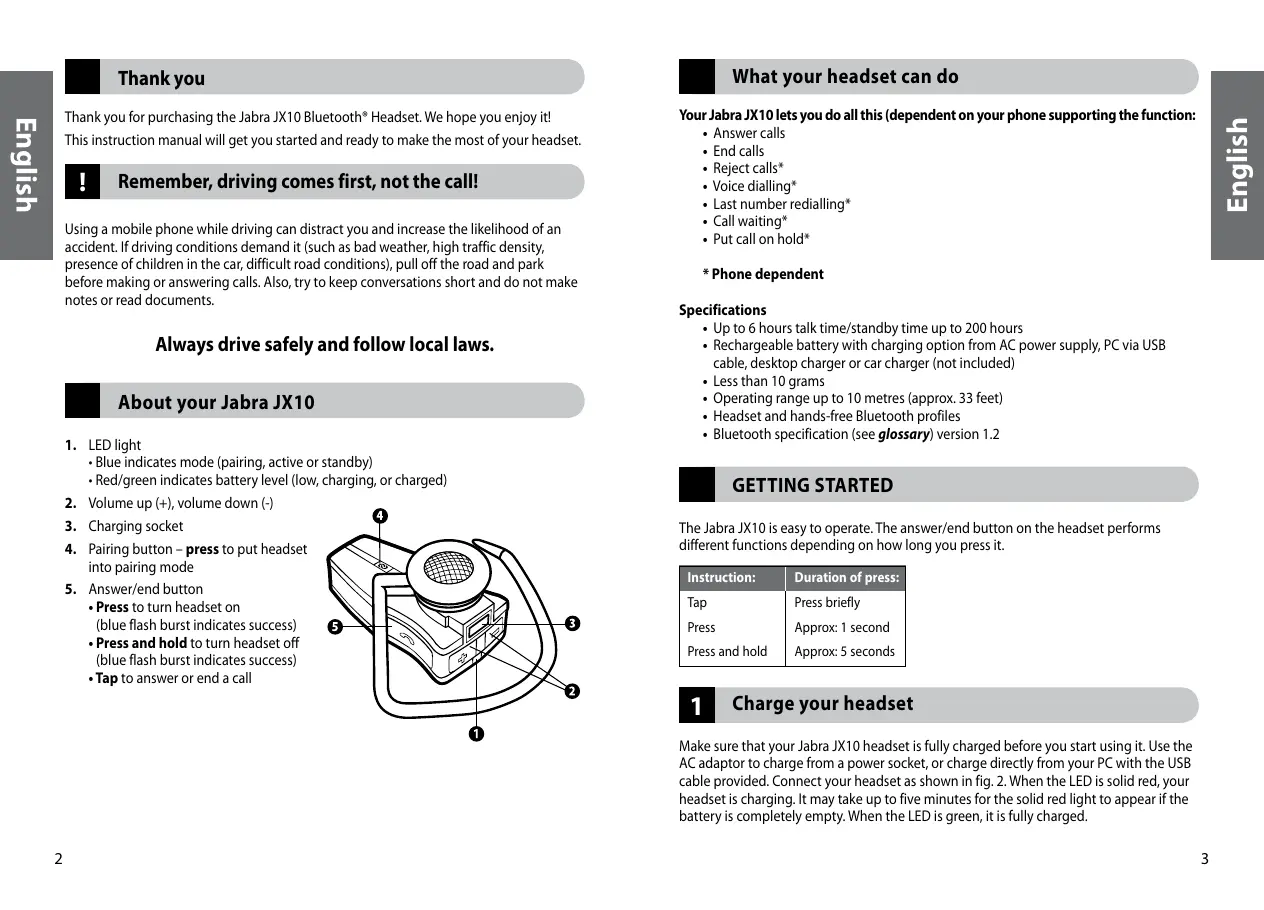 Always drive safely and follow local laws. About your Jabra JX10 1. LED light • Blue indicates mode (pairing, active or standby) • Red/green indicates battery level (low, charging, or charged) 2. Volume up (+), volume down (-) 3. Charging socket 4. Pairing button – press to put headset into pairing mode 5. Answer/end button • Press to turn headset on (blue flash burst indicates success) • Press and hold to turn headset off (blue flash burst indicates success) • Tap to answer or end a call