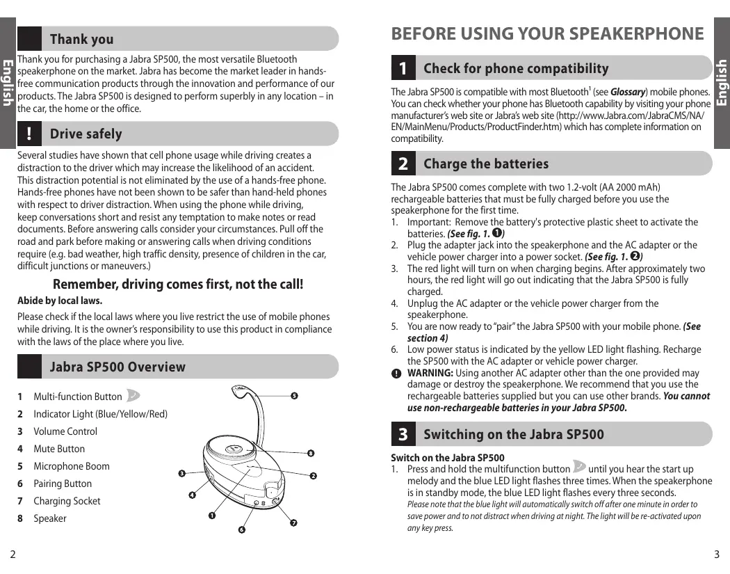 Before using your Jabra SP500, ensure that the batteries are charged and the Jabra SP500 is paired (see item 3) with your Bluetooth mobile phone and switched on. The speakerphone can be used while being recharged from a wall socket or from the car charger.
