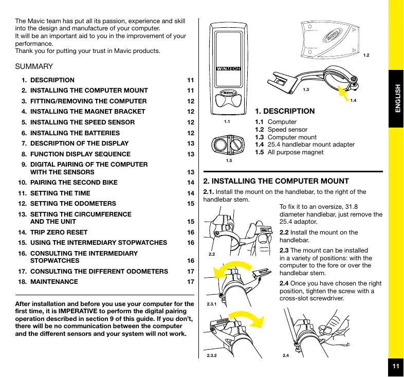 The Mavic team has put all its passion, experience and skill into the design and manufacture of your computer. It will be an important aid to you in the improvement of your performance. Thank you for putting your trust in Mavic products.