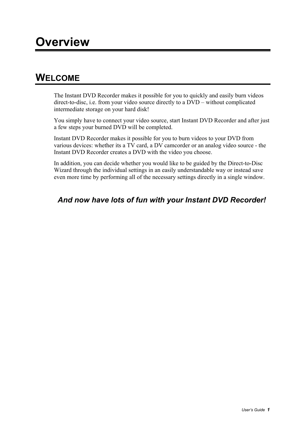 Overview WELCOME The Instant DVD Recorder makes it possible for you to quickly and easily burn videos direct-to-disc, i.e. from your video source directly to a DVD — without complicated intermediate storage on your hard disk! You simply have to connect your video source, start Instant DVD Recorder and after just a few steps your burned DVD will be completed. Instant DVD Recorder makes it possible for you to burn videos to your DVD from various devices: whether its a TV card, a DV camcorder or an analog video source - the Instant DVD Recorder creates a DVD with the video you choose. In addition, you can decide whether you would like to be guided by the Direct-to-Disc Wizard through the individual settings in an easily understandable way or instead save even more time by performing all of the necessary settings directly in a single window. And now have lots of fun with your Instant DVD Recorder! User's Guide 1