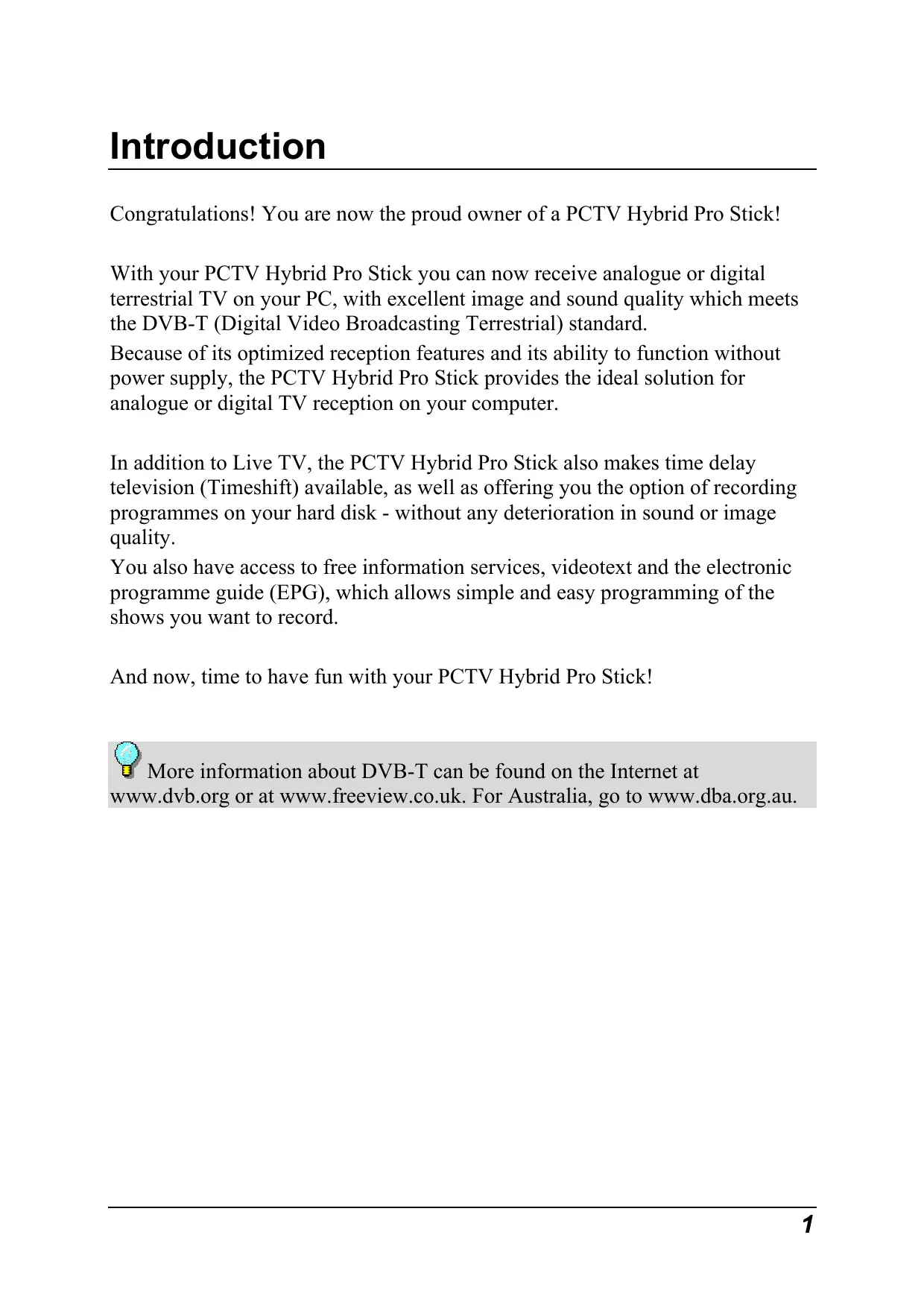 With your PCTV Hybrid Pro Stick you can now receive analogue or digital terrestrial TV on your PC, with excellent image and sound quality which meets the DVB-T (Digital Video Broadcasting Terrestrial) standard.
