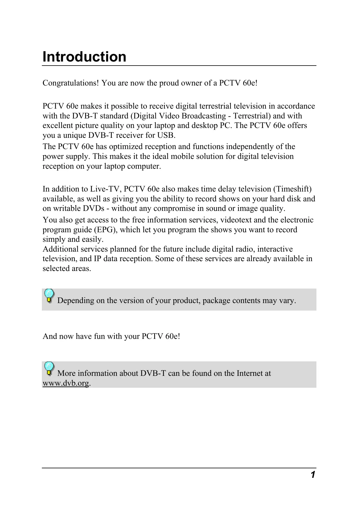 (@ Depending on the version of your product, package contents may vary. And now have fun with your PCTV 60e!