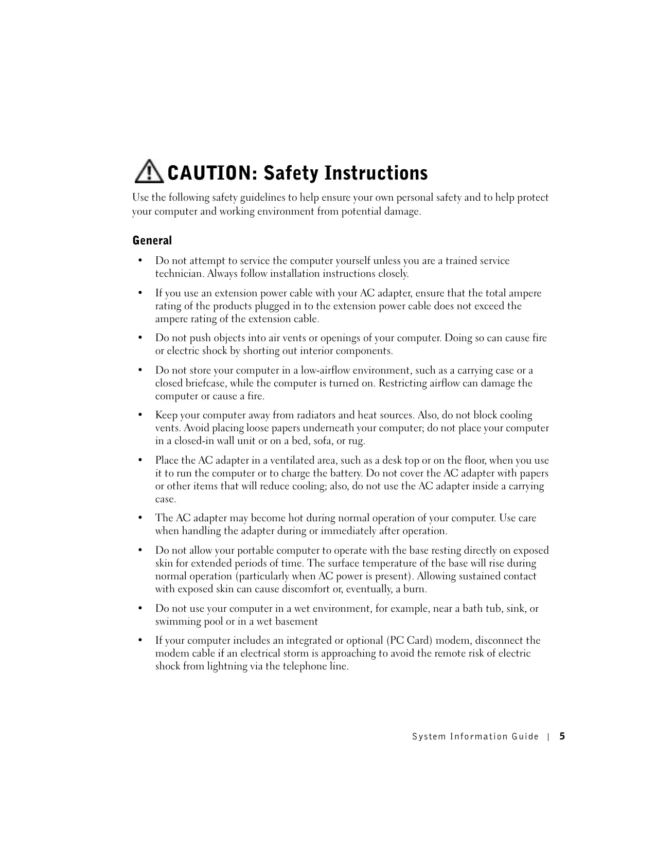 CAUTION: Safety Instructions Use the following safety guidelines to help ensure your own personal safety and to help protect your computer and working environment from potential damage. General