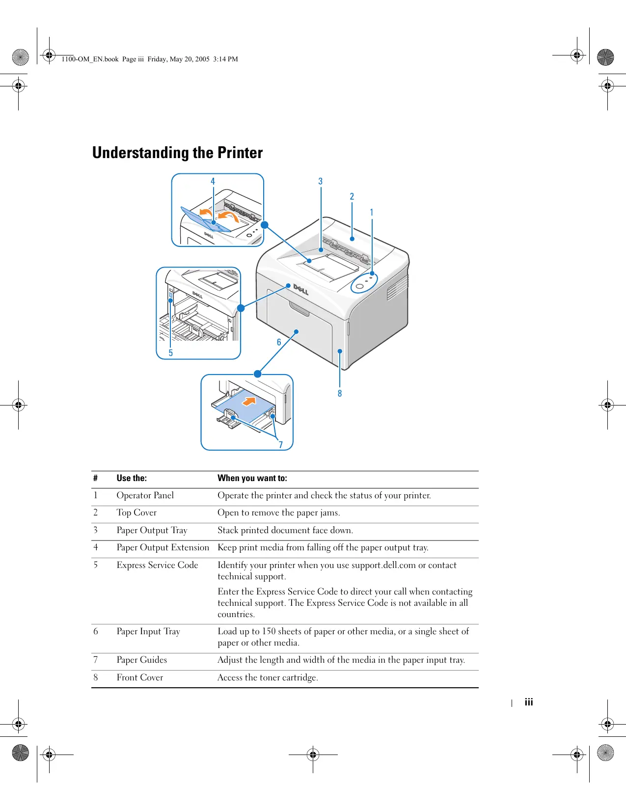 —+|e@ e+— & TI00-OM_EN.book Page ï Friday, May 20, 2005 3:14 PM Understanding the Printer Use the: When you want to: Operator Panel Operate the printer and check the status of your printer. Top Cover Open to remove the paper jams Paper Output Tray Stack printed document face down. Paper Output Extension Keep print media from falling off the paper output tray ul æ&l ln Express Service Code Identify your printer when you use support.dell.com or contact technical support. Enter the Express Service Code to direct your call when contacting technical support. The Express Service Code is not available in all countries. Paper Input Tray Load up to 150 sheets of paper or other media, or a single shect of paper or other media. Paper Guides Adjust the length and width of the media in the paper input tray. Front Cover Access the toner cartridge.