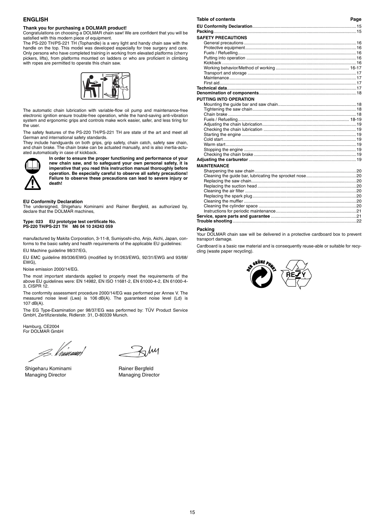 The undersigned, Shigeharu Kominami and Rainer Bergfeld, as authorized by, declare that the DOLMAR machines, Type: 023 EU prototype test certificate No. PS-220 TH/PS-221 TH M6 04 10 24243 059