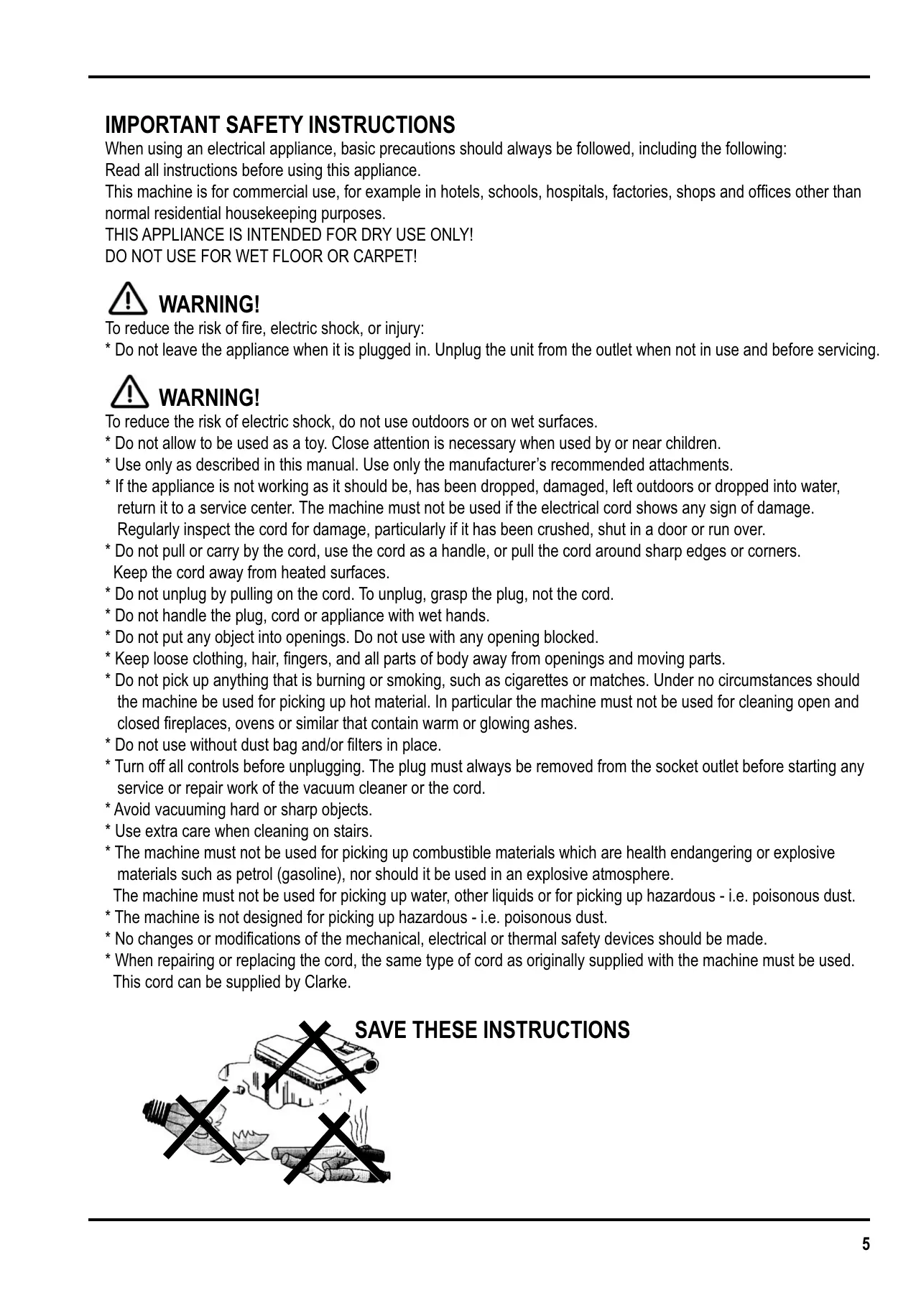 To reduce the risk of electric shock, do not use outdoors or on wet surfaces. * Do not allow to be used as a toy. Close attention is necessary when used by or near children. * Use only as described in this manual. Use only the manufacturer’s recommended attachments. * If the appliance is not working as it should be, has been dropped, damaged, left outdoors or dropped into water, return it to a service center. The machine must not be used if the electrical cord shows any sign of damage. Regularly inspect the cord for damage, particularly if it has been crushed, shut in a door or run over. * Do not pull or carry by the cord, use the cord as a handle, or pull the cord around sharp edges or corners. Keep the cord away from heated surfaces. * Do not unplug by pulling on the cord. To unplug, grasp the plug, not the cord. * Do not handle the plug, cord or appliance with wet hands. * Do not put any object into openings. Do not use with any opening blocked. * Keep loose clothing, hair, fingers, and all parts of body away from openings and moving parts. * Do not pick up anything that is burning or smoking, such as cigarettes or matches. Under no circumstances should the machine be used for picking up hot material. In particular the machine must not be used for cleaning open and closed fireplaces, ovens or similar that contain warm or glowing ashes. * Do not use without dust bag and/or filters in place. * Turn off all controls before unplugging. The plug must always be removed from the socket outlet before starting any service or repair work of the vacuum cleaner or the cord. * Avoid vacuuming hard or sharp objects. * Use extra care when cleaning on stairs. * The machine must not be used for picking up combustible materials which are health endangering or explosive materials such as petrol (gasoline), nor should it be used in an explosive atmosphere. The machine must not be used for picking up water, other liquids or for picking up hazardous - i.e. poisonous dust. * The machine is not designed for picking up hazardous - i.e. poisonous dust. * No changes or modifications of the mechanical, electrical or thermal safety devices should be made. * When repairing or replacing the cord, the same type of cord as originally supplied with the machine must be used. This cord can be supplied by Clarke.