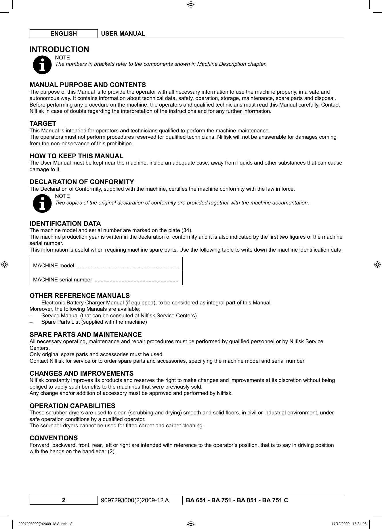 – Manuel du chargeur de batterie électronique, si équipé, qui constitue une partie intégrante de ce manuel Les manuels suivants sont aussi disponibles : – Manuel d’entretien (consultable auprès des Services après-vente Nilfisk) – Catalogue de pièces de rechange (livré avec la machine)